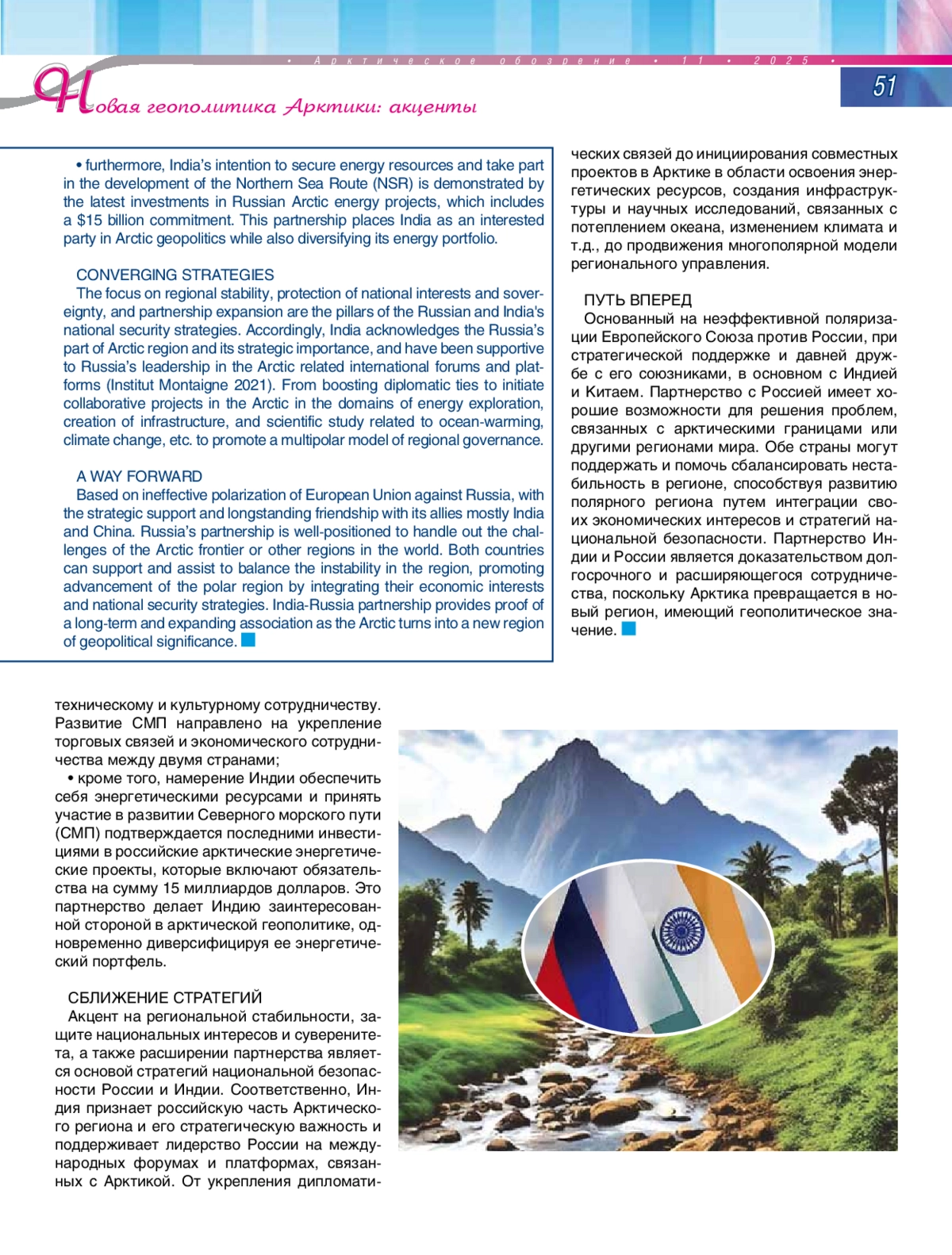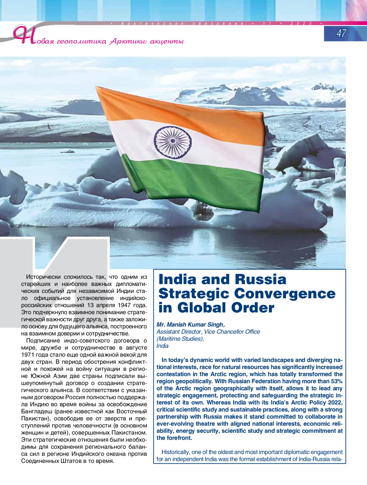 В современном динамичном мире с разнообразными ландшафтами и расходящимися национальными интересами борьба за природные ресурсы значительно усилила напряженность в Арктическом регионе, что полностью изменило регион в геополитическом плане. Географическое положение Российской Федерации, занимающей более 53% территории Арктического региона, позволяет ей возглавлять любое стратегическое взаимодействие, защищая свои собственные стратегические интересы. Принимая во внимание, что Индия с ее Арктической политикой до 2022 года, критическими научными исследованиями и устойчивыми практиками, а также прочным партнерством с Россией, твердо намерена сотрудничать на постоянно развивающемся театре военных действий, ориентируясь на согласованные национальные интересы, экономическую надежность, энергетическую безопасность, научные исследования и стратегическую приверженность во главу угла.