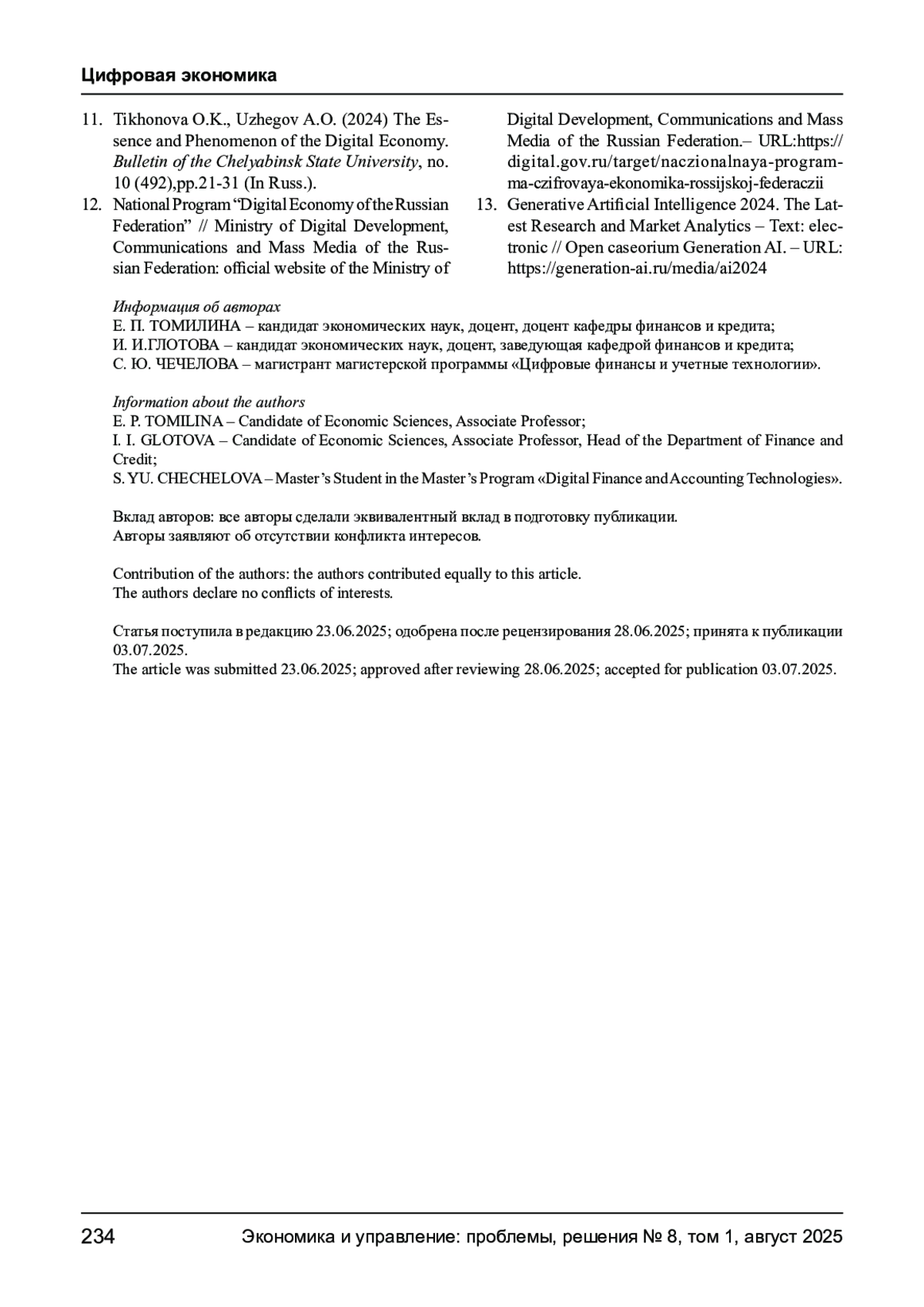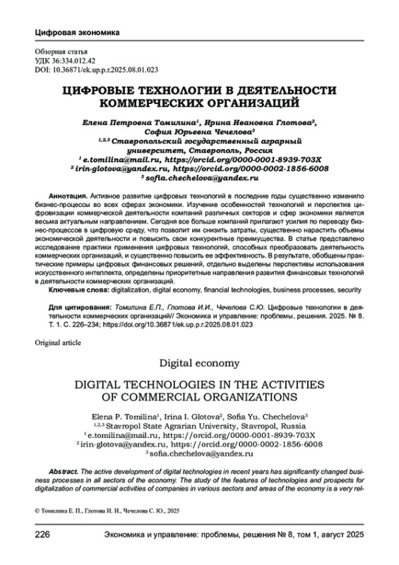 ТОМИЛИНА Е. П., ГЛОТОВА И. И., ЧЕЧЕЛОВА С. Ю. ЦИФРОВЫЕ ТЕХНОЛОГИИ В ДЕЯТЕЛЬНОСТИ КОММЕРЧЕСКИХ ОРГАНИЗАЦИЙ // ЭКОНОМИКА И УПРАВЛЕНИЕ: ПРОБЛЕМЫ, РЕШЕНИЯ. 2025. ТОМ 1 № 8