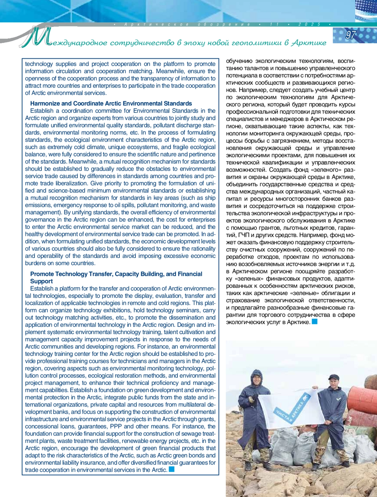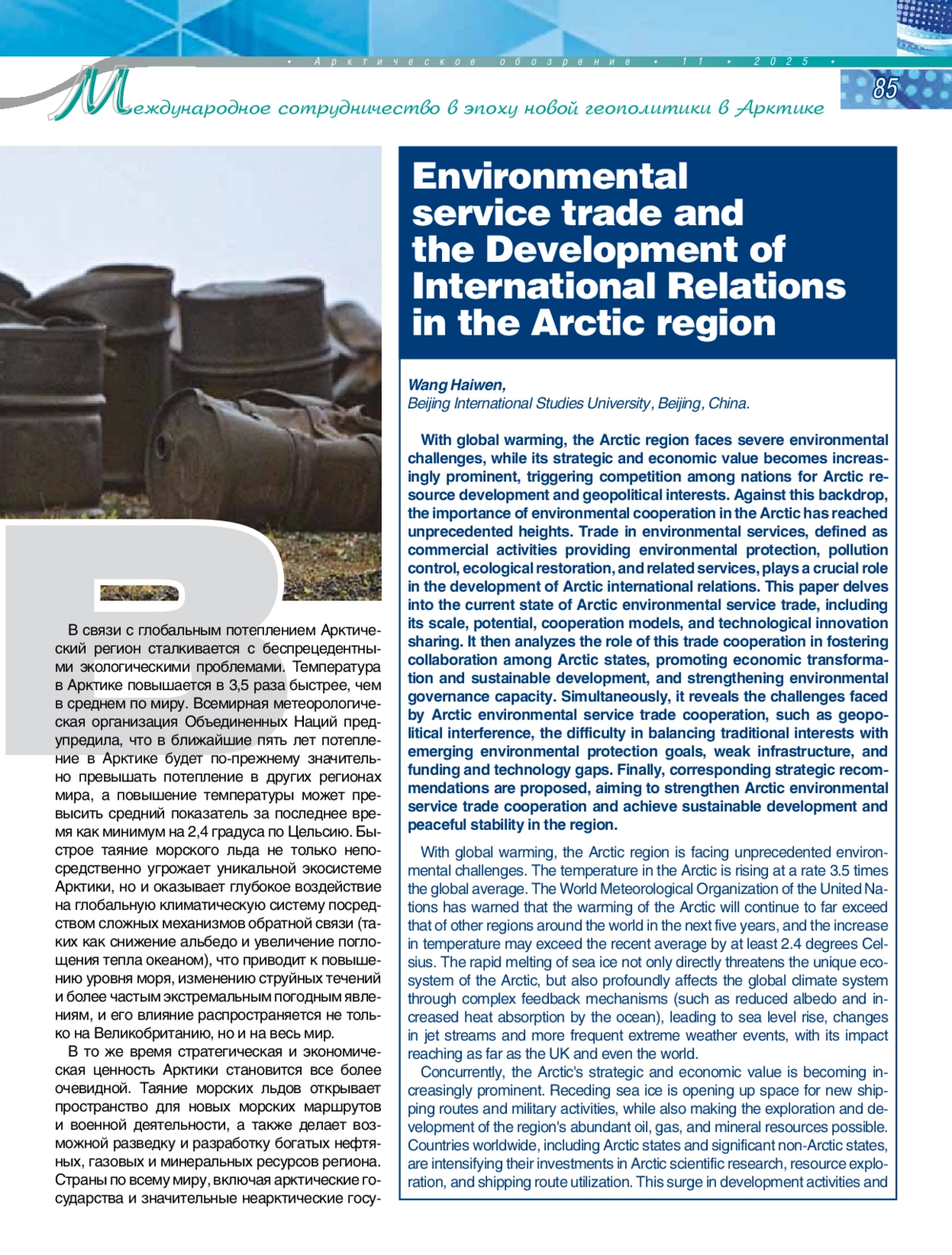 В связи с глобальным потеплением Арктический регион сталкивается с серьезными экологическими проблемами, в то время как его стратегическая и экономическая ценность становится все более очевидной, вызывая конкуренцию между странами за освоение арктических ресурсов и геополитические интересы. На этом фоне важность экологического сотрудничества в Арктике достигла беспрецедентных высот. Торговля экологическими услугами, определяемая как коммерческая деятельность, обеспечивающая охрану окружающей среды, борьбу с загрязнением, восстановление окружающей среды и сопутствующие услуги, играет решающую роль в развитии международных отношений в Арктике. В статье рассматривается текущее состояние торговли экологическими услугами в Арктике, включая ее масштабы, потенциал, модели сотрудничества и обмен технологическими инновациями. Далее в нем анализируется роль этого торгового сотрудничества в укреплении взаимодействия между арктическими государствами, содействии экономическим преобразованиям и устойчивому развитию, а также в укреплении потенциала экологического управления. Одновременно в нем раскрываются проблемы, с которыми сталкивается сотрудничество в сфере торговли экологическими услугами в Арктике, такие как геополитическое вмешательство, трудности с балансированием традиционных интересов с новыми целями в области охраны окружающей среды, слабая инфраструктура, а также нехватка финансирования и технологий. В заключение предлагаются соответствующие стратегические рекомендации, направленные на укрепление сотрудничества в сфере торговли экологическими услугами в Арктике и достижение устойчивого развития и мирной стабильности в регионе.