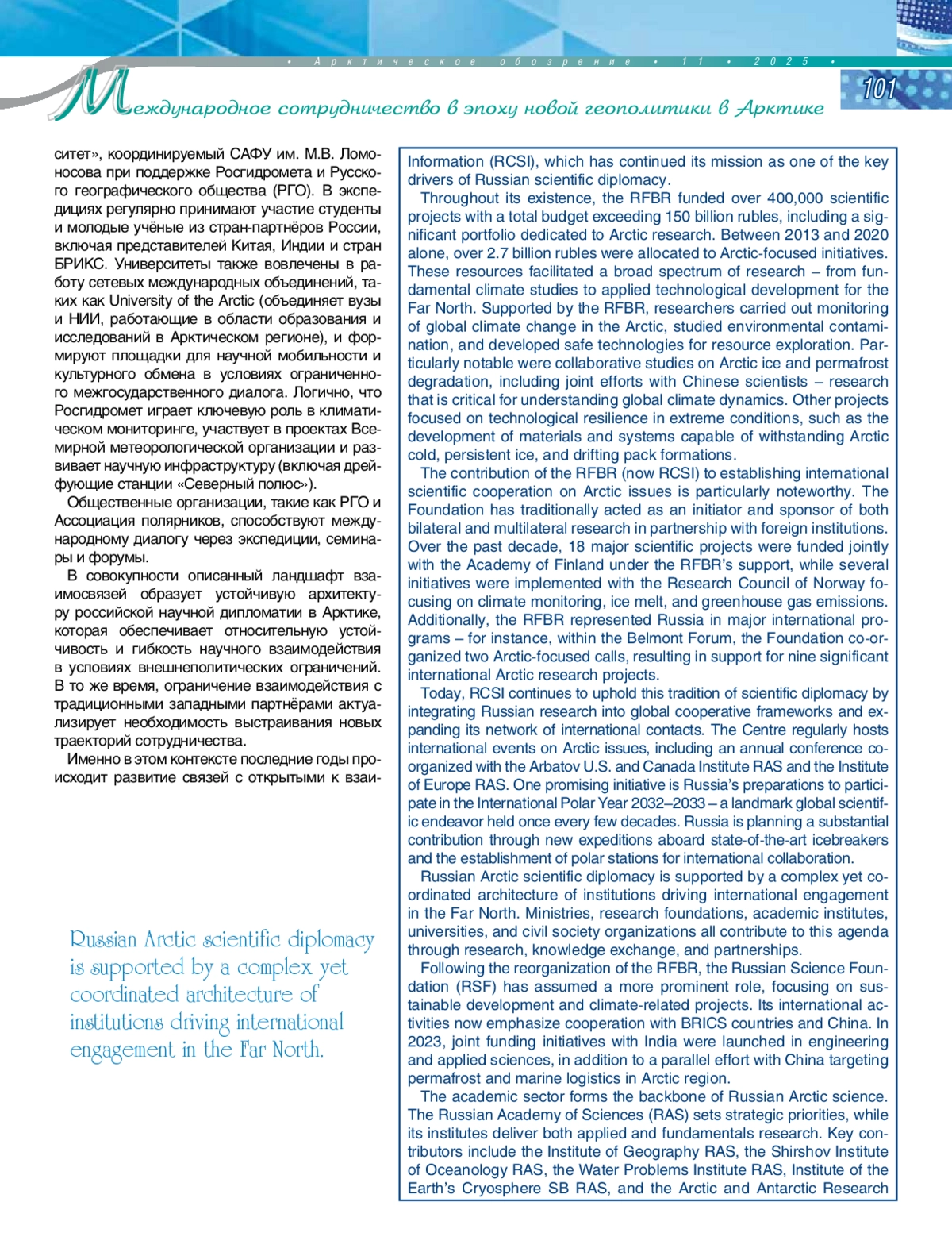 Однако, экономических намерений недостаточно: Арктика – хрупкая экосистема, требующая международной координации усилий в сфере экологии, науки и безопасности. В условиях глобальной турбулентности и санкций, которые коллективный Запад применяет против России, научная дипломатия приобретает всё большее значение. Научное сотрудничество остаётся одной из немногих относительно нейтральных площадок, где может продолжаться конструктивный диалог несмотря на политические разногласия.