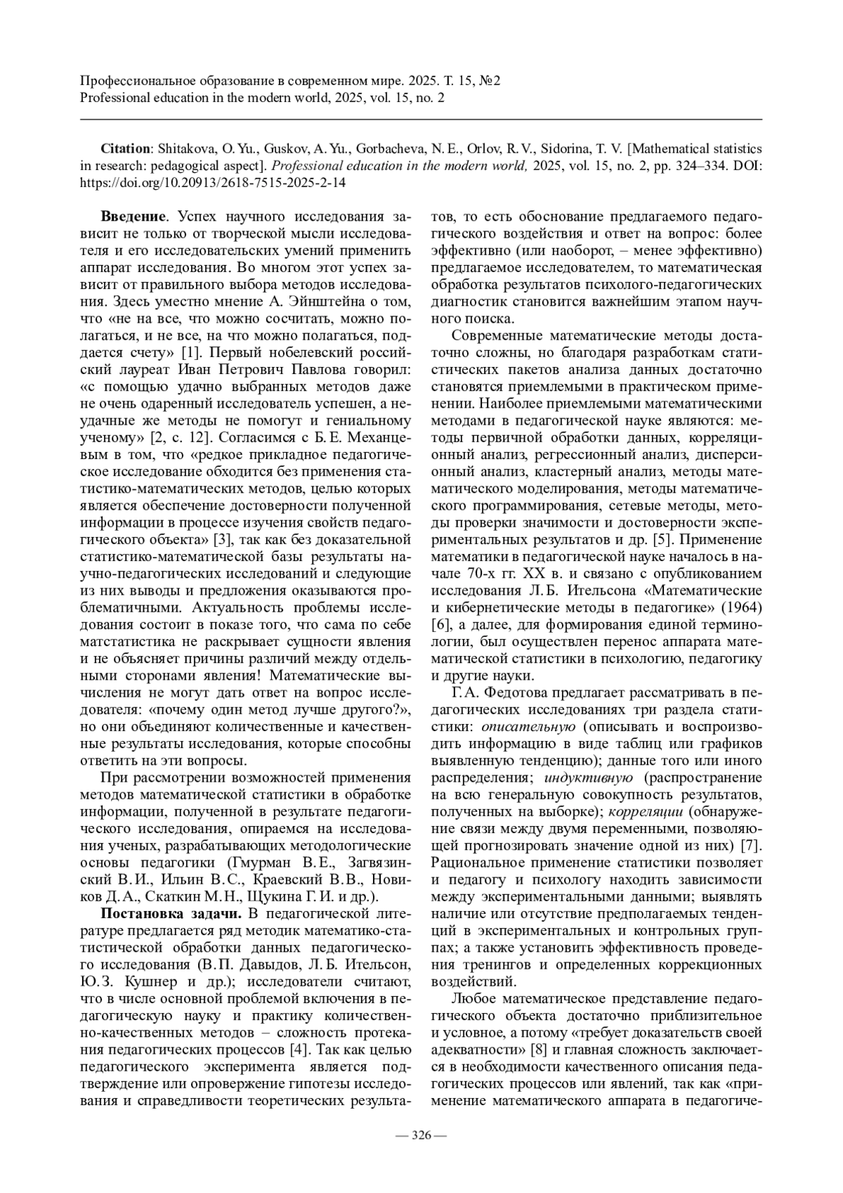 Результаты. К результатам работы можно отнести описание и анализ проблем, связанных с раскрытием понятий зависимой и независимой переменных в педагогическом исследовании, количественных и качественных методов исследования, критериев и показателей оценки результатов исследований. Раскрыто представление о том, что только рациональное применение статистики позволяет и педагогу находить зависимости между экспериментальными данными, выявлять наличие или отсутствие тенденций в экспериментальных и контрольных группах. Авторами предложены методы математической статистики, которые они применили в своих педагогических исследованиях: критерий φ* Фишера, критерий Краскела – Уоллиса, критерий «хи» – квадрат Пирсона и методика И. К. Шалаева по оценке результативности экспериментальной работы.
