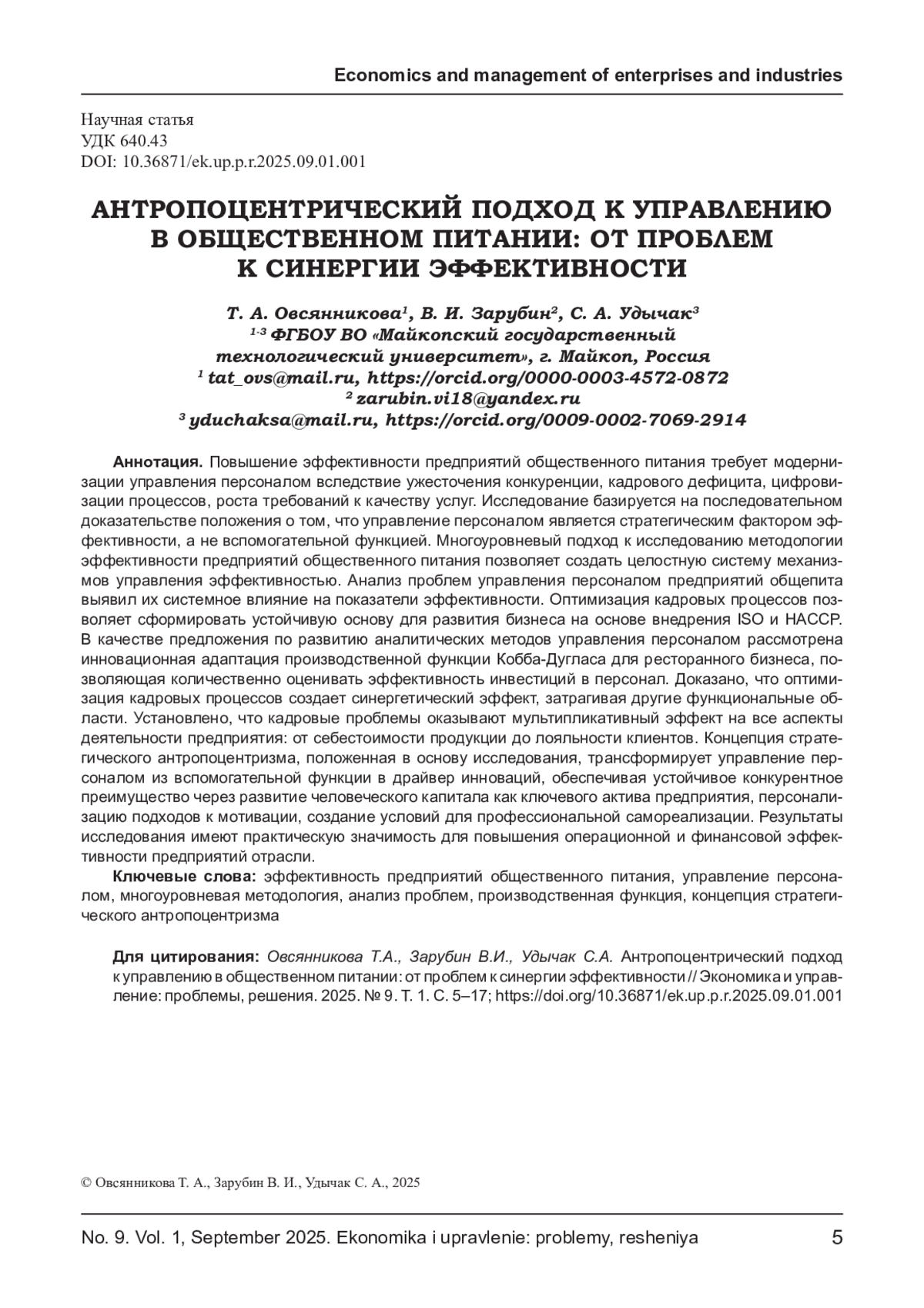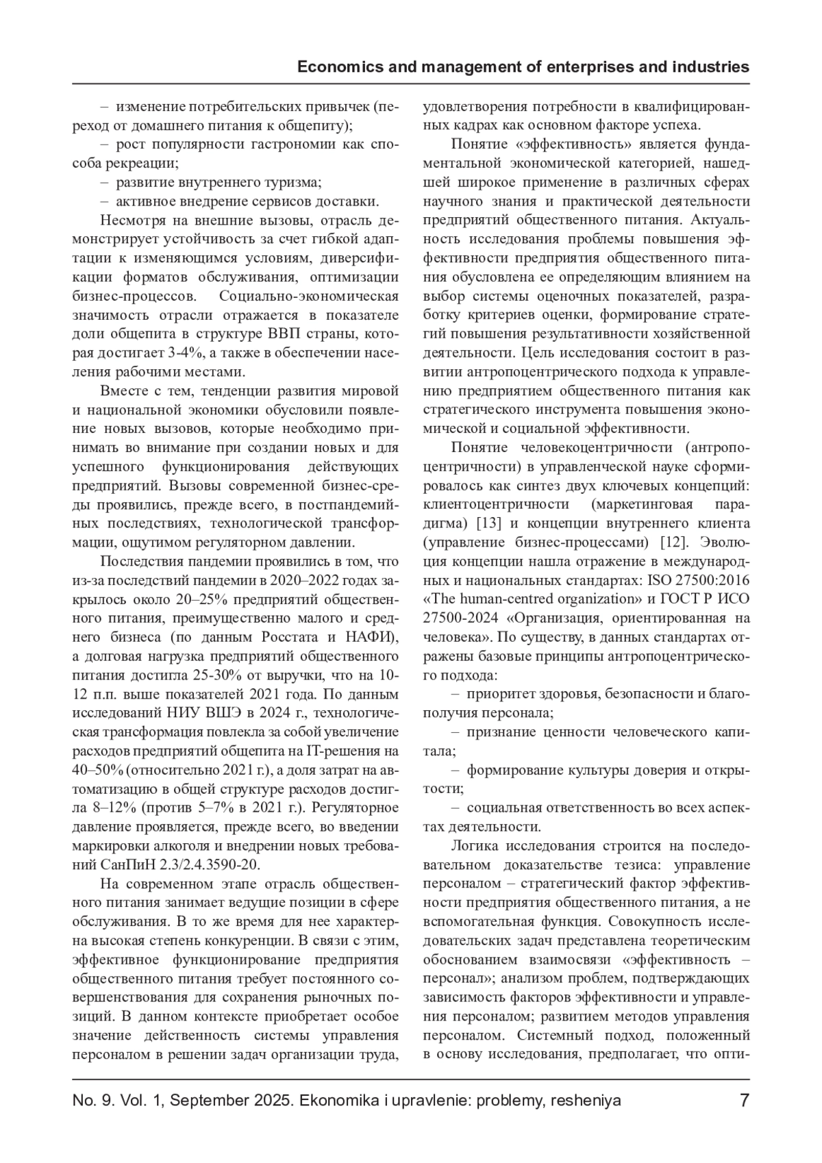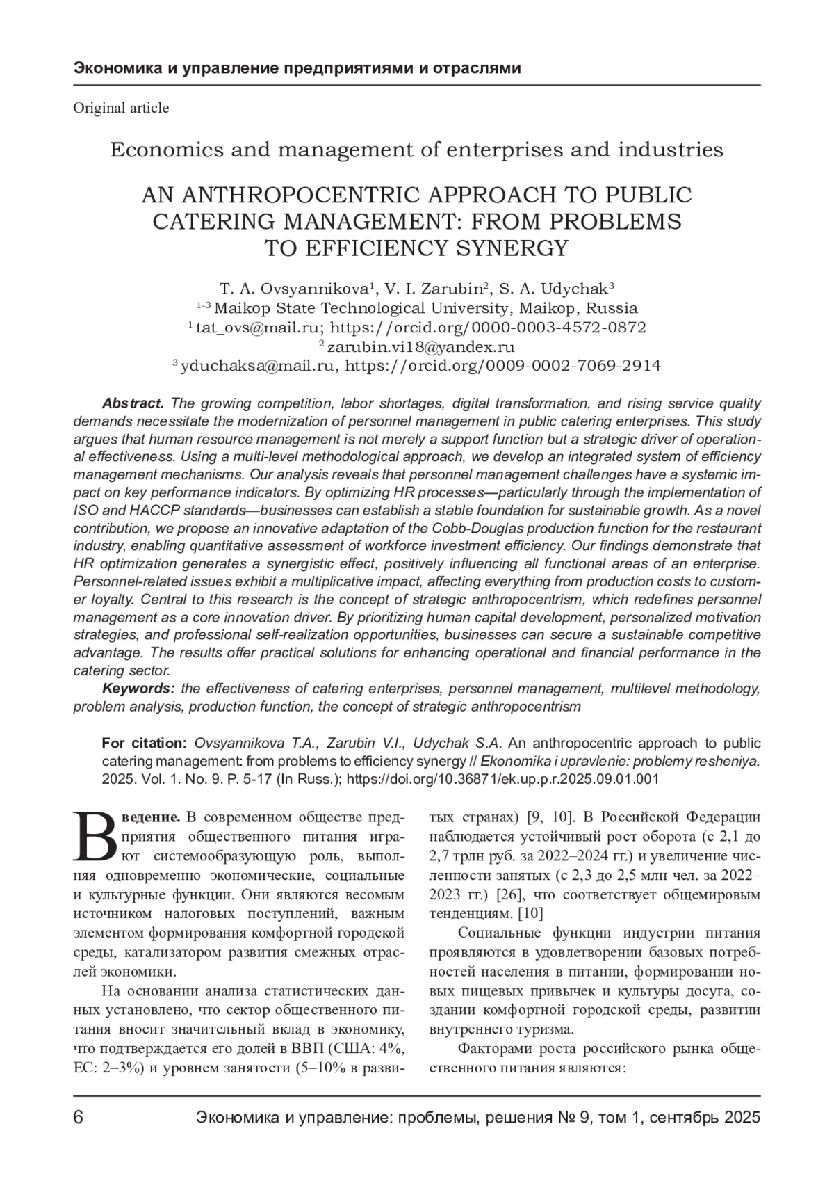 Повышение эффективности предприятий общественного питания требует модернизации управления персоналом вследствие ужесточения конкуренции, кадрового дефицита, цифровизации процессов, роста требований к качеству услуг. Исследование базируется на последовательном доказательстве положения о том, что управление персоналом является стратегическим фактором эффективности, а не вспомогательной функцией. Многоуровневый подход к исследованию методологии эффективности предприятий общественного питания позволяет создать целостную систему механизмов управления эффективностью. Анализ проблем управления персоналом предприятий общепита выявил их системное влияние на показатели эффективности. Оптимизация кадровых процессов позволяет сформировать устойчивую основу для развития бизнеса на основе внедрения ISO и HACCP. В качестве предложения по развитию аналитических методов управления персоналом рассмотрена инновационная адаптация производственной функции Кобба-Дугласа для ресторанного бизнеса, позволяющая количественно оценивать эффективность инвестиций в персонал. Доказано, что оптимизация кадровых процессов создает синергетический эффект, затрагивая другие функциональные области. Установлено, что кадровые проблемы оказывают мультипликативный эффект на все аспекты деятельности предприятия: от себестоимости продукции до лояльности клиентов. Концепция стратегического антропоцентризма, положенная в основу исследования, трансформирует управление персоналом из вспомогательной функции в драйвер инноваций, обеспечивая устойчивое конкурентное преимущество через развитие человеческого капитала как ключевого актива предприятия, персонализацию подходов к мотивации, создание условий для профессиональной самореализации. Результаты исследования имеют практическую значимость для повышения операционной и финансовой эффективности предприятий отрасли.