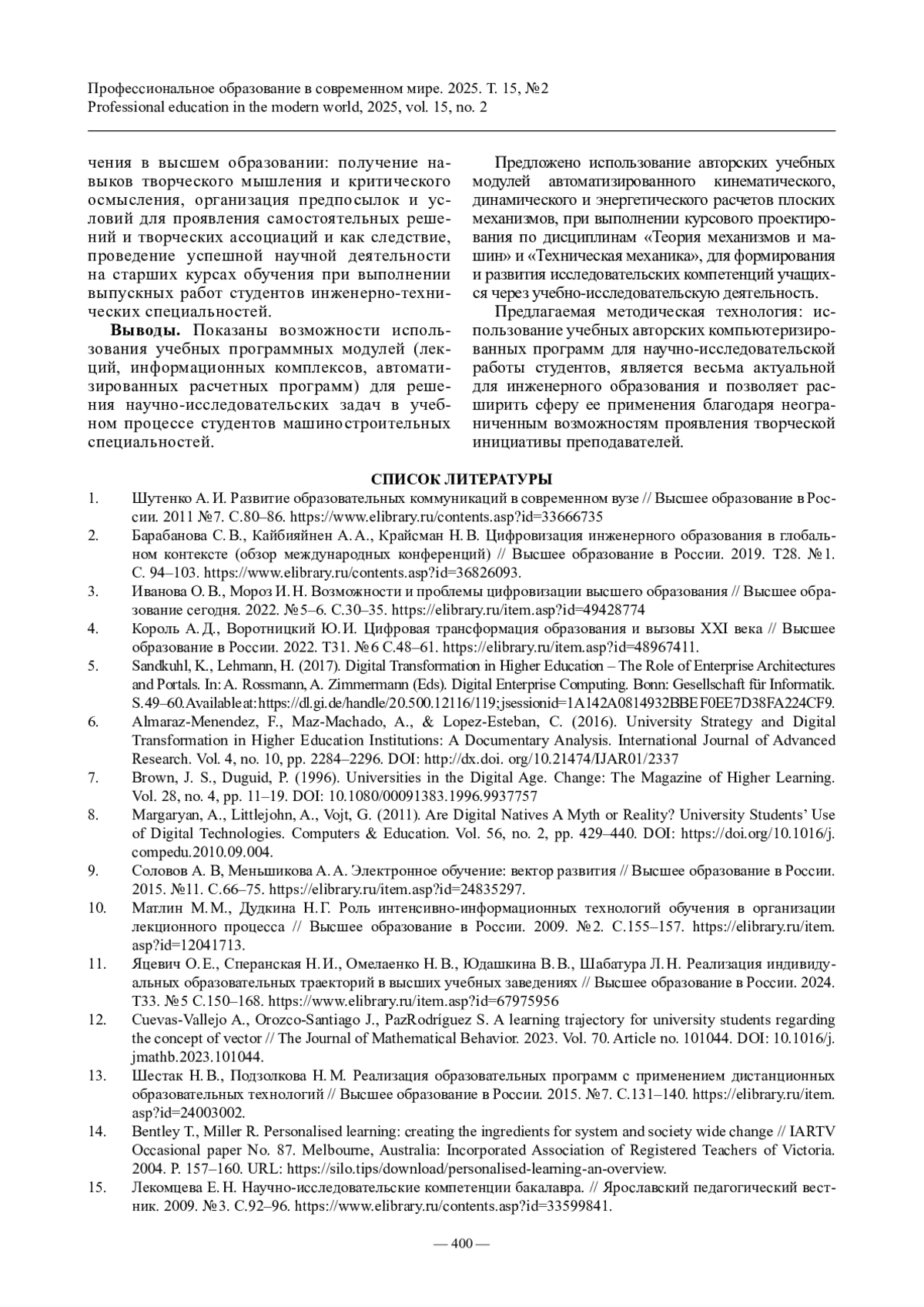 ДУДКИНА Н. Г., ПРИХОДЬКОВА И. В. ИСПОЛЬЗОВАНИЕ ВОЗМОЖНОСТЕЙ ЦИФРОВЫХ ОБРАЗОВАТЕЛЬНЫХ ТЕХНОЛОГИЙ В НАУЧНО-ИССЛЕДОВАТЕЛЬСКОЙ ДЕЯТЕЛЬНОСТИ СТУДЕНТОВ // ПРОФЕССИОНАЛЬНОЕ ОБРАЗОВАНИЕ В СОВРЕМЕННОМ МИРЕ. 2025. Т. 15, № 2