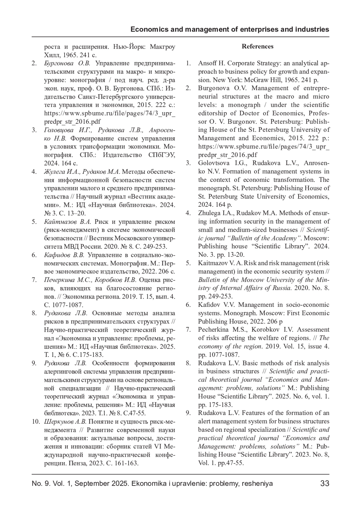 РУДАКОВА Л. В. СИСТЕМНЫЙ МЕТОД УПРАВЛЕНИЯ РИСКАМИ В ПРЕДПРИНИМАТЕЛЬСКИХ СТРУКТУРАХ // ЭКОНОМИКА И УПРАВЛЕНИЕ: ПРОБЛЕМЫ, РЕШЕНИЯ. 2025. ТОМ 1 № 9