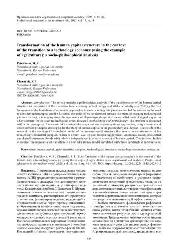 Введение. В статье осуществлен философский анализ трансформации структуры человеческого капитала в условиях перехода к экономике технологий и искусственного интеллекта.