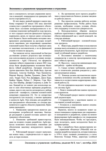1. Лобасев Д.В. Agile-подход к разработке программных продуктов: истоки и перспективы // Инновации и инвестиции. - 2022. - №11. - С. 210-214. EDN: ORMBIK