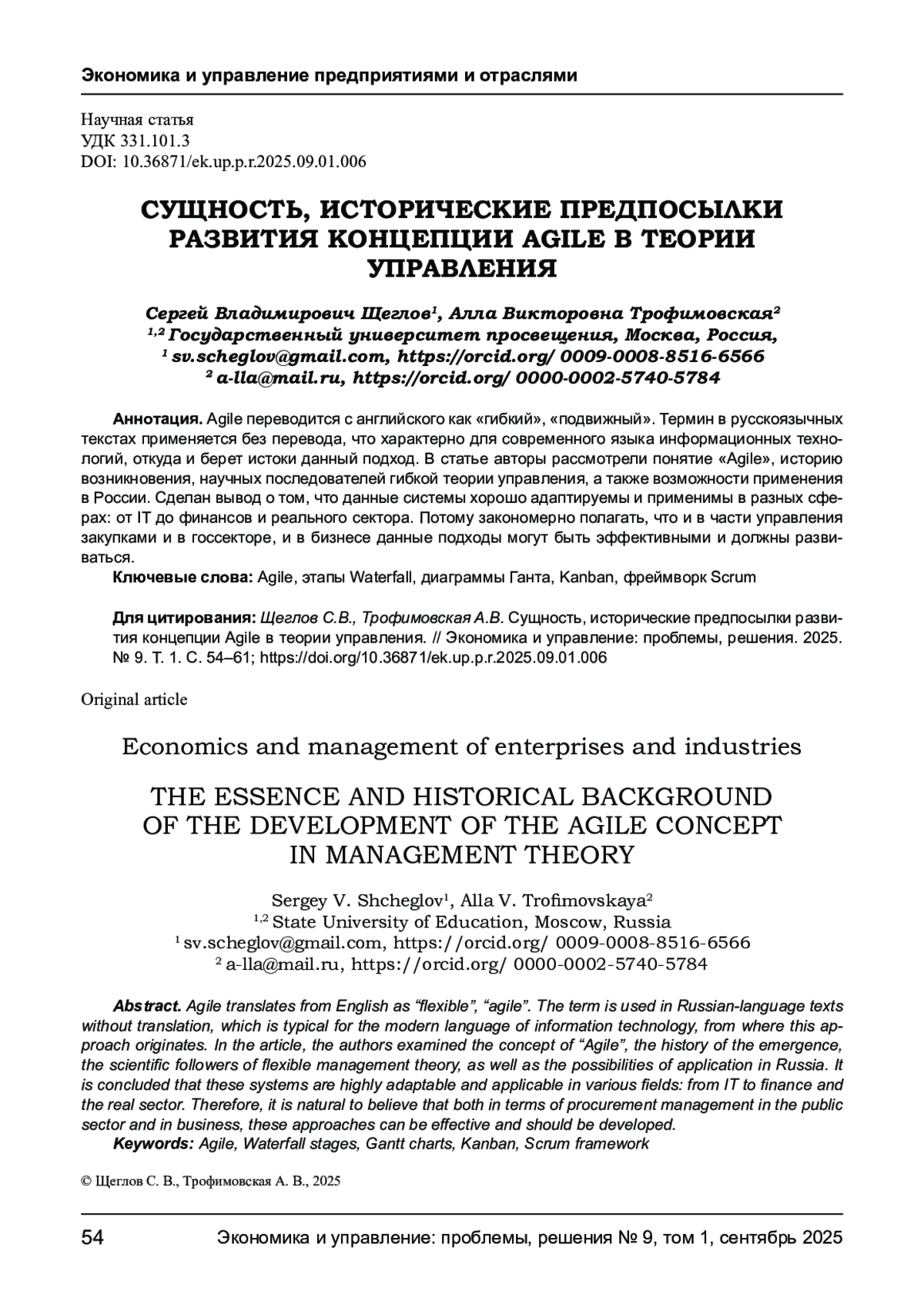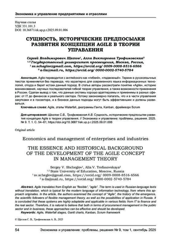 Agile переводится с английского как «гибкий», «подвижный». Термин в русскоязычных текстах применяется без перевода, что характерно для современного языка информационных технологий, откуда и берет истоки данный подход. В статье авторы рассмотрели понятие «Agile», историю возникновения, научных последователей гибкой теории управления, а также возможности применения в России. Сделан вывод о том, что данные системы хорошо адаптируемы и применимы в разных сферах: от IT до финансов и реального сектора. Потому закономерно полагать, что и в части управления закупками и в госсекторе, и в бизнесе данные подходы могут быть эффективными и должны развиваться.
