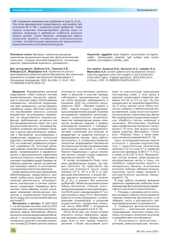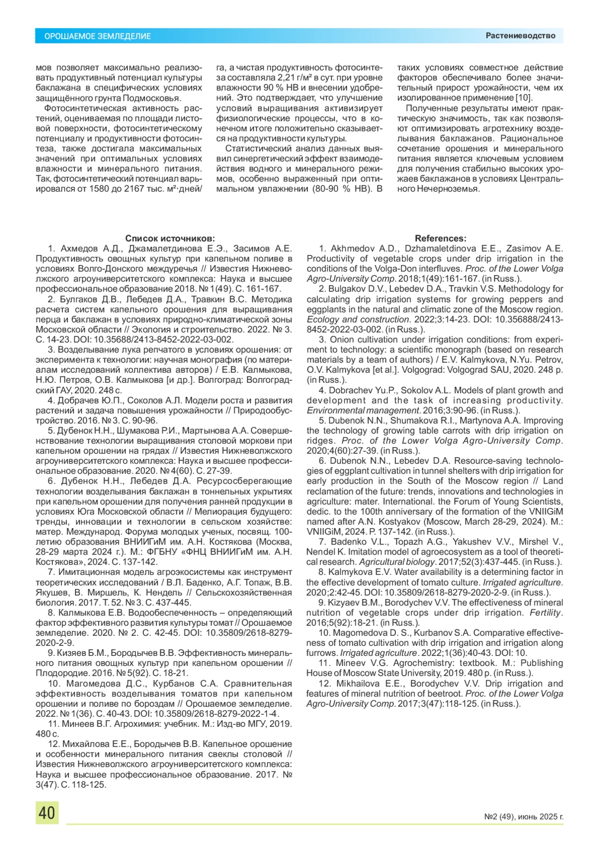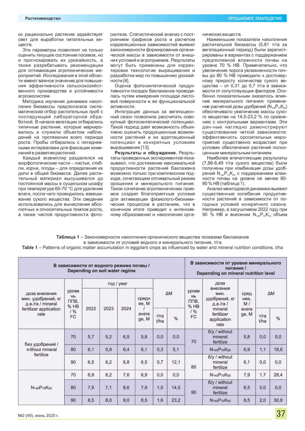 Изучены закономерности роста и формирования ранних баклажанов при использовании капельного орошения в южных районах Московской области. Эксперимент проводился по схеме с двумя переменными: первый фактор (А) отражал уровень увлажнения, второй фактор (В) – минеральное питание. В рамках полевых испытаний исследовалось влияние влажности грунта и внесения питательных веществ на вегетацию, формирование плодов и урожайность сорта «Черный опал», культивируемого под временными тоннельными укрытиями для получения ранней продукции. Анализировалась скорость наращивания органической массы как индикатор благоприятности агрономических условий. Отдельное внимание уделялось изучению фотосинтеза, который оценивался по следующим критериям: размеру листовой поверхности, фотосинтетической активности и продуктивности фотосинтеза. Пик развития листьев (27,4-32,8 тыс. м²/га) отмечался на 20-й день после начала плодоношения, а общий фотосинтетический потенциал за сезон колебался в пределах от 1580 до 2167 тыс. м²·дней/га. Повышение качества полива и питания положительно влияло на эти параметры. Полученные данные помогают не только контролировать состояние посадок, но и прогнозировать их продуктивность, а также совершенствовать агротехнические методы выращивания. Выявлена взаимосвязь между режимом орошения, применением минеральных удобрений и эффективностью фотосинтеза. Полученные результаты свидетельствуют о том, что для получения урожайности на уровне 40 т/га и выше необходимо поддерживать предполивную влажность почвы на уровне не ниже 80 % НВ и применять минеральные удобрения в дозе N P K. 140 70 50 При этом максимальная продуктивность достигается при сочетании 90 % НВ с указанной дозой удобрений. Такой подход позволяет минимизировать расход воды на единицу продукции и добиваться стабильно высокого уровня урожая. Таким образом, проведенная работа позволила выявить оптимальные агротехнические условия, способствующие максимальной продуктивности и рациональному использованию ресурсов.