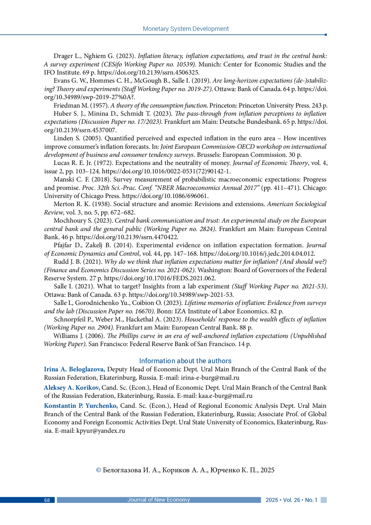 7. Кориков А. А., Юрченко К. П. (2023). Инфляционные ожидания и потребительские настроения населения Урала // Journal of New Economy. Т. 24, № 4. С. 125-147. DOI: 10.29141/2658-5081-2023-24-4-7 EDN: CFHXUM