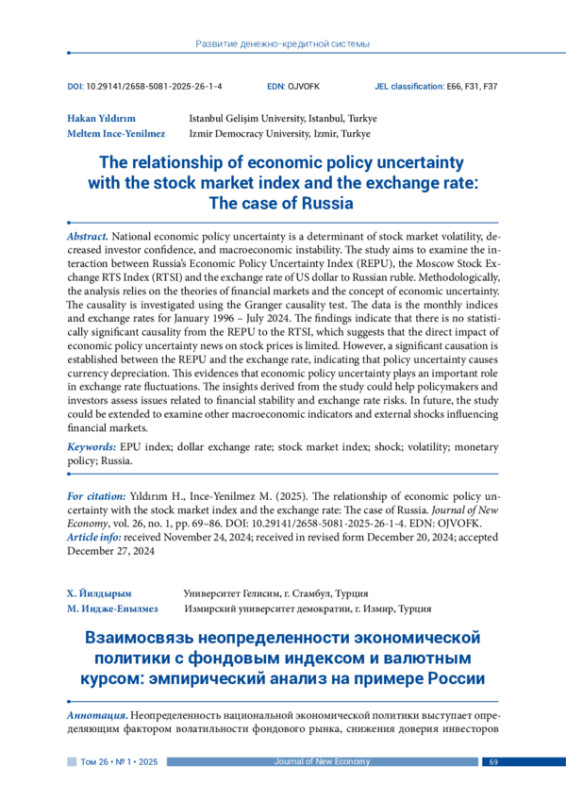 National economic policy uncertainty is a determinant of stock market volatility, decreased investor confidence, and macroeconomic instability. The study aims to examine the interaction between Russia’s Economic Policy Uncertainty Index (REPU), the Moscow Stock Exchange RTS Index (RTSI) and the exchange rate of US dollar to Russian ruble. Methodologically, the analysis relies on the theories of financial markets and the concept of economic uncertainty. The causality is investigated using the Granger causality test. The data is the monthly indices and exchange rates for January 1996 – July 2024. The findings indicate that there is no statistically significant causality from the REPU to the RTSI, which suggests that the direct impact of economic policy uncertainty news on stock prices is limited. However, a significant causation is established between the REPU and the exchange rate, indicating that policy uncertainty causes currency depreciation. This evidences that economic policy uncertainty plays an important role in exchange rate fluctuations. The insights derived from the study could help policymakers and investors assess issues related to financial stability and exchange rate risks. In future, the study could be extended to examine other macroeconomic indicators and external shocks influencing financial markets