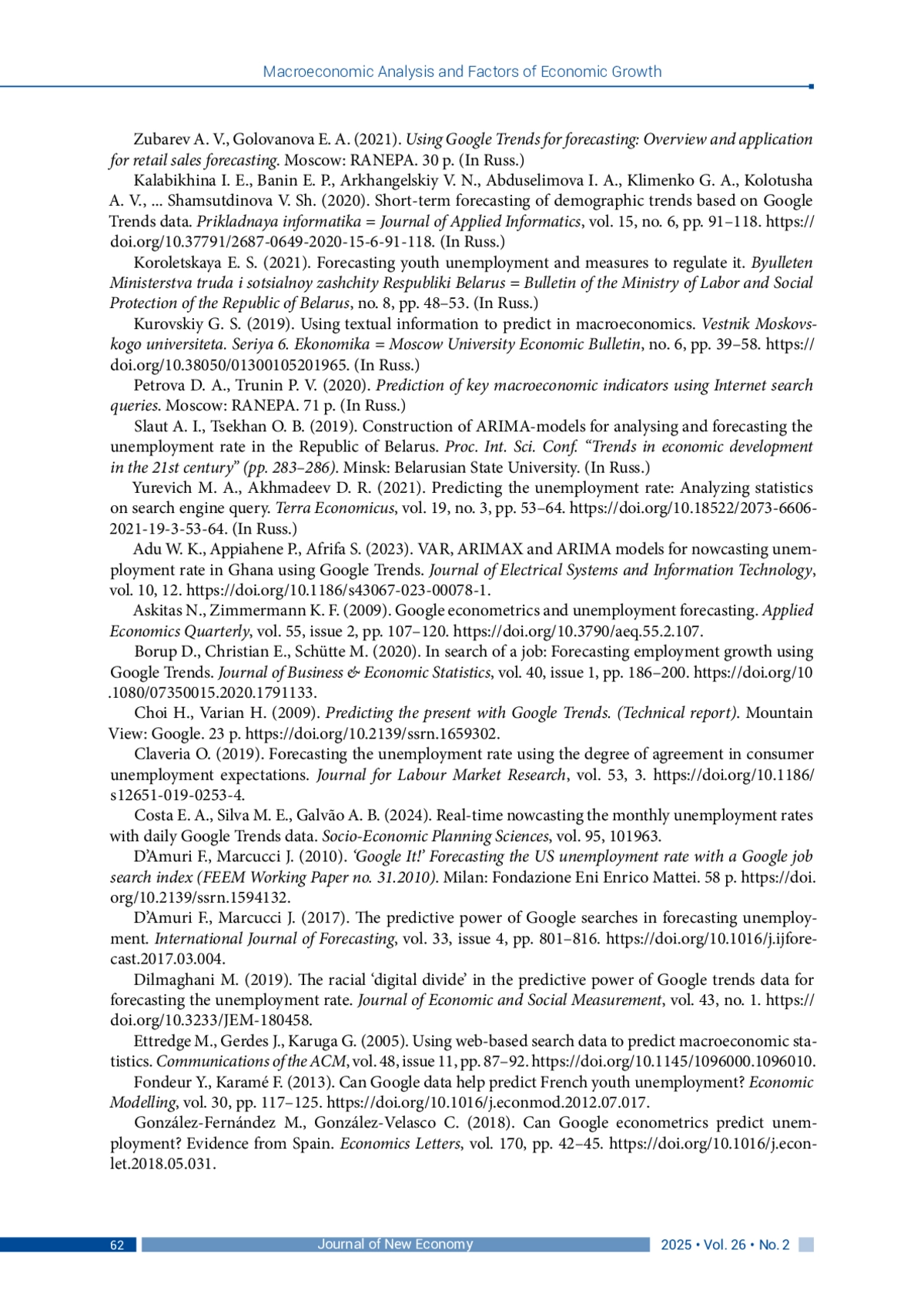 Проблема прогнозирования уровня безработицы в Республике Беларусь остается актуальной в условиях динамично изменяющейся экономической среды. Традиционные методы прогнозирования, основанные на официальной статистике, зачастую не учитывают оперативные изменения на рынке труда, что снижает их точность. В то же время данные поисковых запросов доказали свою эффективность в качестве опережающих индикаторов в других странах, однако, их применение в Беларуси остается неизученным. Статья посвящена оценке возможности использования данных поисковых запросов для повышения точности прогнозирования уровня безработицы в Республике Беларусь. Методологическую основу исследования сформировали теоретические положения макроэкономики и модели SARIMA, VAR и SARIMAX. Методы включали декомпозицию временных рядов, тест Дики – Фуллера для оценки стационарности, дифференцирование, стандартизацию данных и тест Грейнджера на причинность. Информационную базу составили данные Национального статистического комитета Республики Беларусь об уровне безработицы за 2015–2024 гг. и данные о поисковых запросах Google, связанные с поиском работы. Выявлено, что модель SARIMAX с включением данных о поисковых запросах превосходит классические модели прогнозирования безработицы, демонстрируя минимальные ошибки. Согласно этой модели, прогнозные значения уровня безработицы показали тенденцию к снижению, что отражает устойчивую динамику улучшения ситуации на рынке труда Республики Беларусь. Полученные результаты подчеркивают значимость комбинирования традиционных данных с цифровыми метриками для повышения точности прогнозов, а также открывают перспективы для дальнейших исследований в области применения интернет-данных для социально-экономического анализа, включая разработку более совершенных моделей прогнозирования безработицы