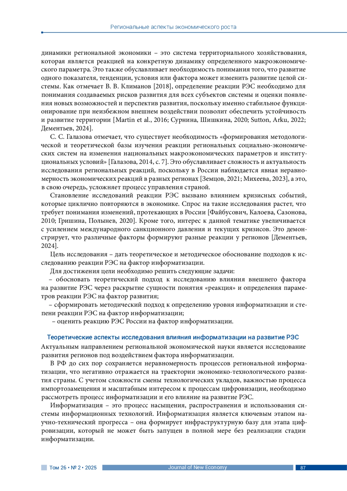 В условиях нестабильности внешней среды особую значимость приобретает исследование воздействия различных факторов на экономическое развитие регионов, среди которых одним из ключевых становится фактор информатизации. При этом продолжает сохраняться региональная дифференциация по уровню информатизации, что требует постоянного мониторинга и выработки соответствующих управленческих решений. Статья посвящена исследованию влияния информатизации на развитие региональной экономической системы. Теоретическую и методологическую основу исследования составили теории факторов регионального развития, концепция региональной экономической системы, теория информатизации. Информационной базой послужили данные Федеральной службы государственной статистики за 2010–2023 гг. Предложена авторская трактовка понятия «реакция региональной экономической системы на фактор развития», которая заключается в понимании скорости и направленности качественных изменений региональной экономической системы. Представлен и апробирован авторский методический подход к оценке реакции региональной экономической системы на фактор информатизации. Выявлена неоднородность реакции региональных экономических систем на фактор информатизации, которые были сгруппированы на четыре типа: регионы с высоким, со средним, с низким и с отрицательным уровнем реакции. Результаты исследования вносят вклад в изучение темпов изменения региональных экономических систем под воздействием внешнего фактора развития и могут быть использованы при разработке и гармонизации федеральной и региональной политик, а также при прогнозировании развития региональных экономических систем с учетом степени реакции