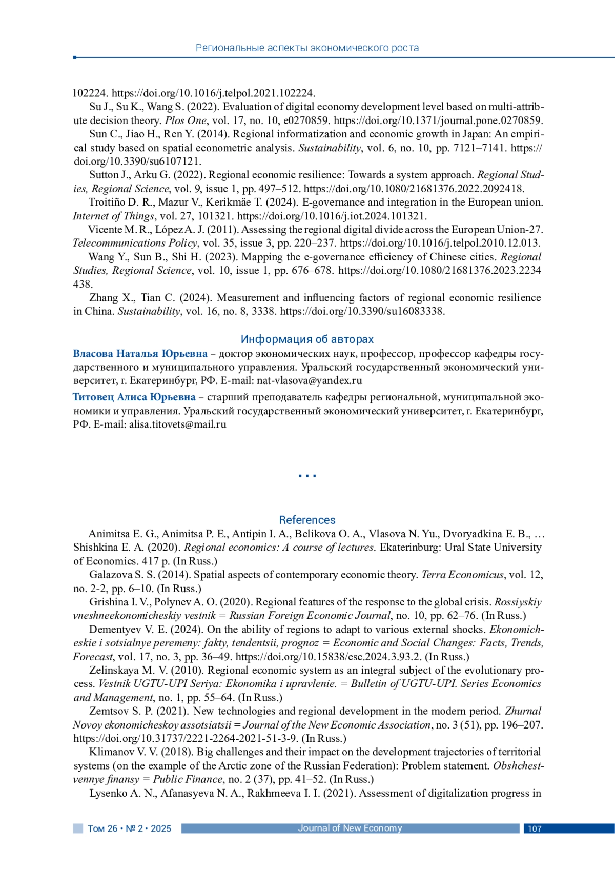 14. Сурнина Н. М., Шишкина Е. А. (2020). Цифровизация как фактор обеспечения устойчивого развития пространственных инфраструктурных систем региона // Научные труды Вольного экономического общества России. Т. 223, № 3. С. 251-259. DOI: 10.38197/2072-2060-2020-223-3-251-259 EDN: NYXNAV