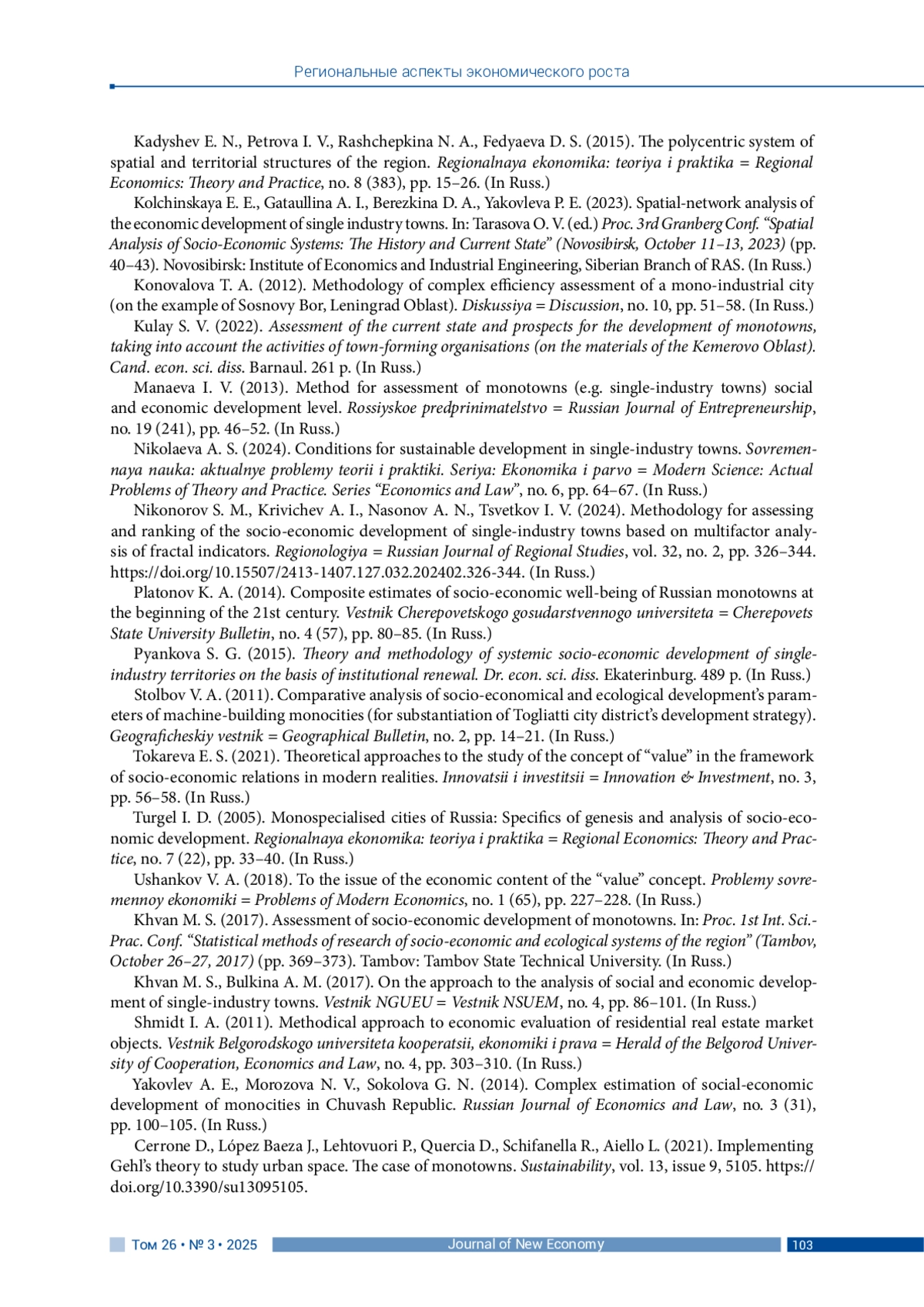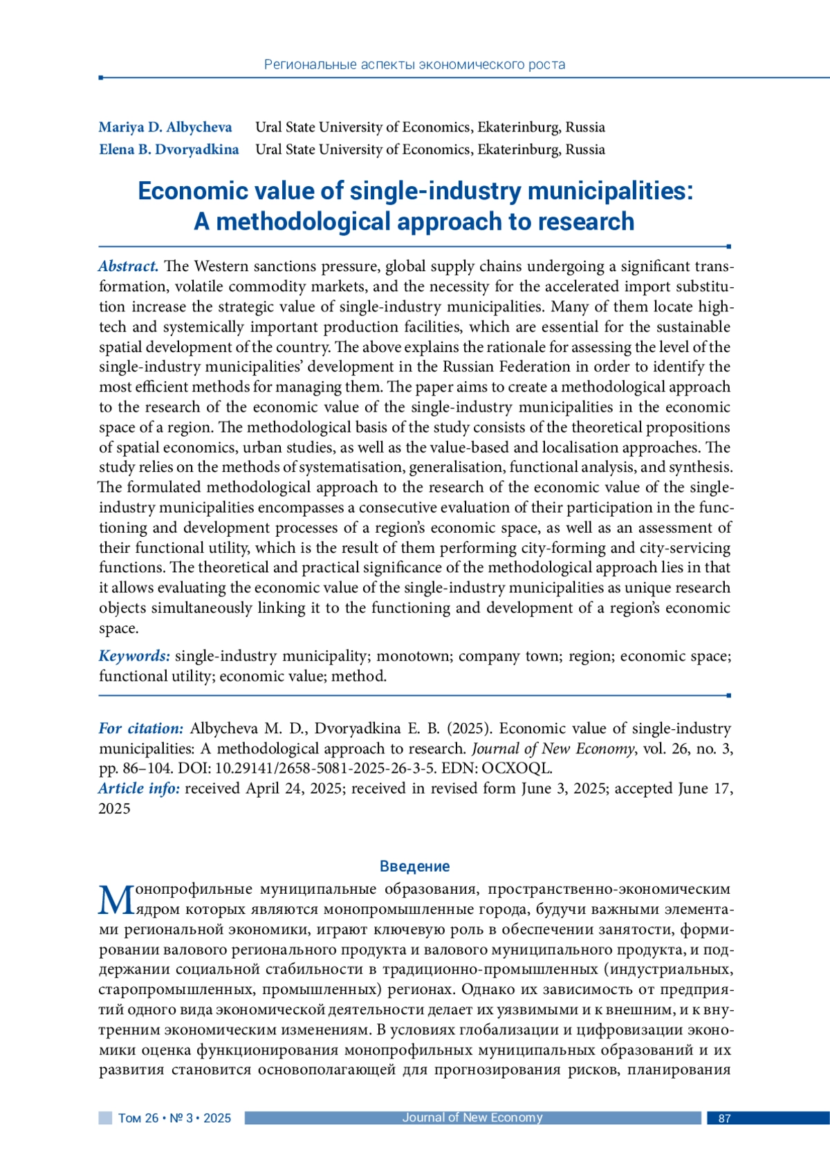 АЛБЫЧЕВА М. Д., ДВОРЯДКИНА Е. Б. ЭКОНОМИЧЕСКАЯ ЦЕННОСТЬ МОНОПРОФИЛЬНЫХ МУНИЦИПАЛЬНЫХ ОБРАЗОВАНИЙ: МЕТОДИЧЕСКИЙ ПОДХОД К ИССЛЕДОВАНИЮ // JOURNAL OF NEW ECONOMY. 2025. Т. 26 № 3