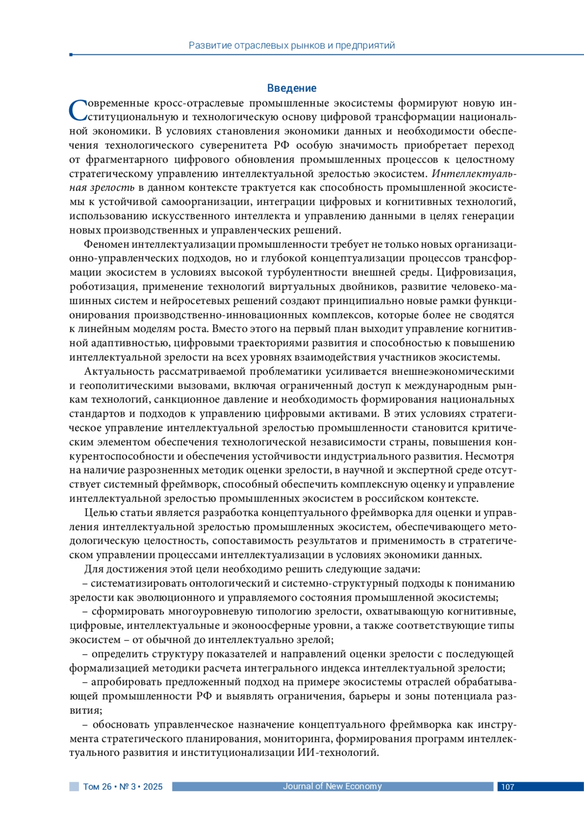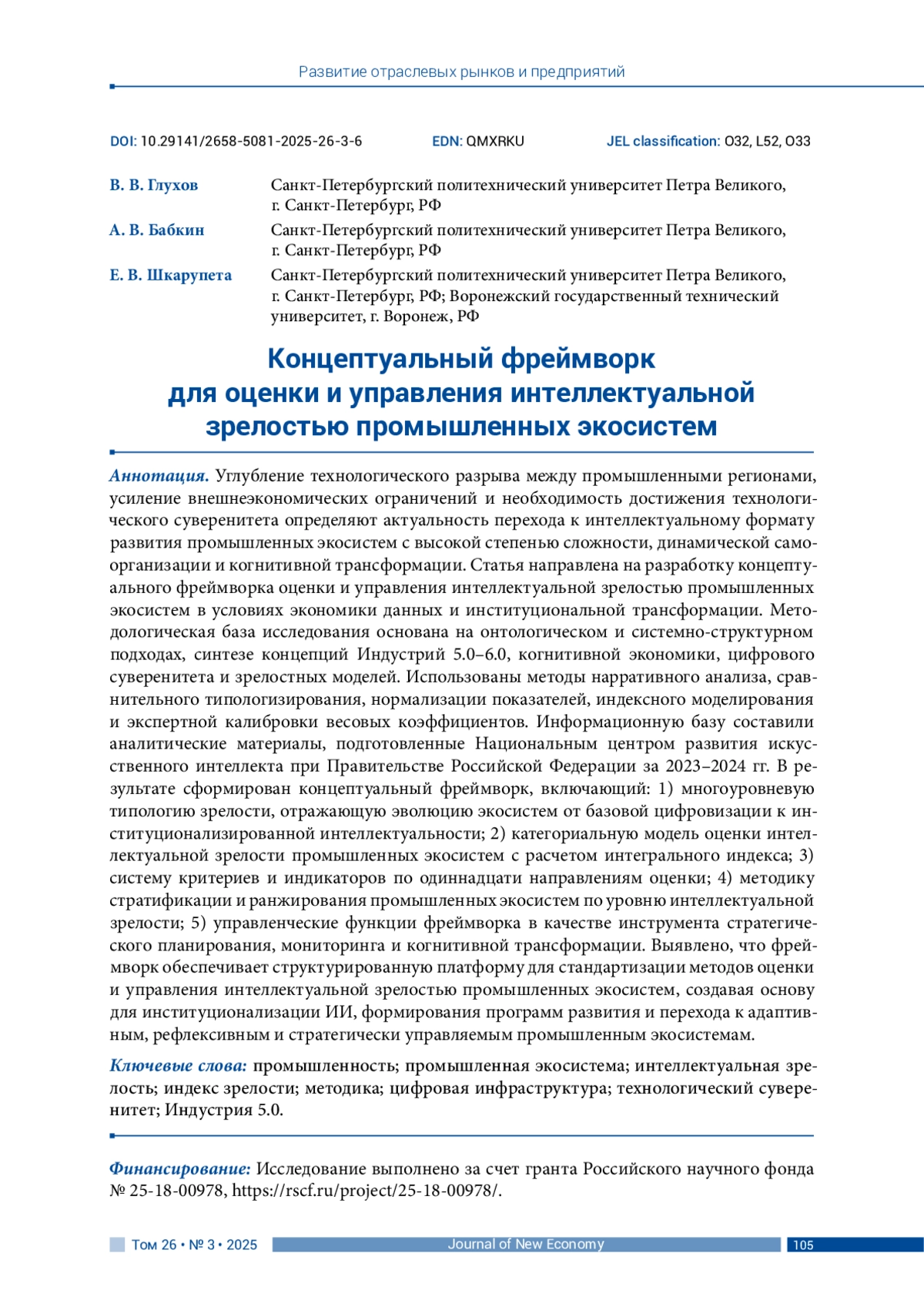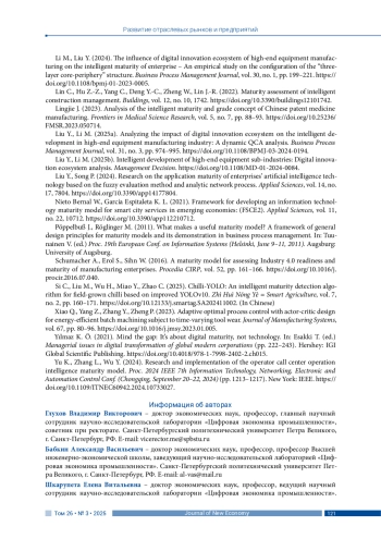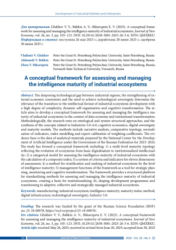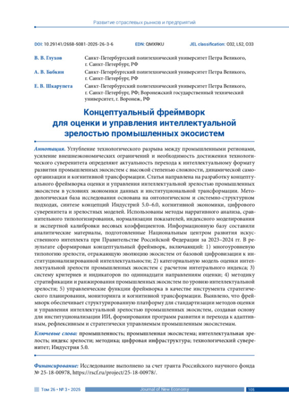 ГЛУХОВ В. В., БАБКИН А. В., ШКАРУПЕТА Е. В. КОНЦЕПТУАЛЬНЫЙ ФРЕЙМВОРК ДЛЯ ОЦЕНКИ И УПРАВЛЕНИЯ ИНТЕЛЛЕКТУАЛЬНОЙ ЗРЕЛОСТЬЮ ПРОМЫШЛЕННЫХ ЭКОСИСТЕМ // JOURNAL OF NEW ECONOMY. 2025. Т. 26 № 3