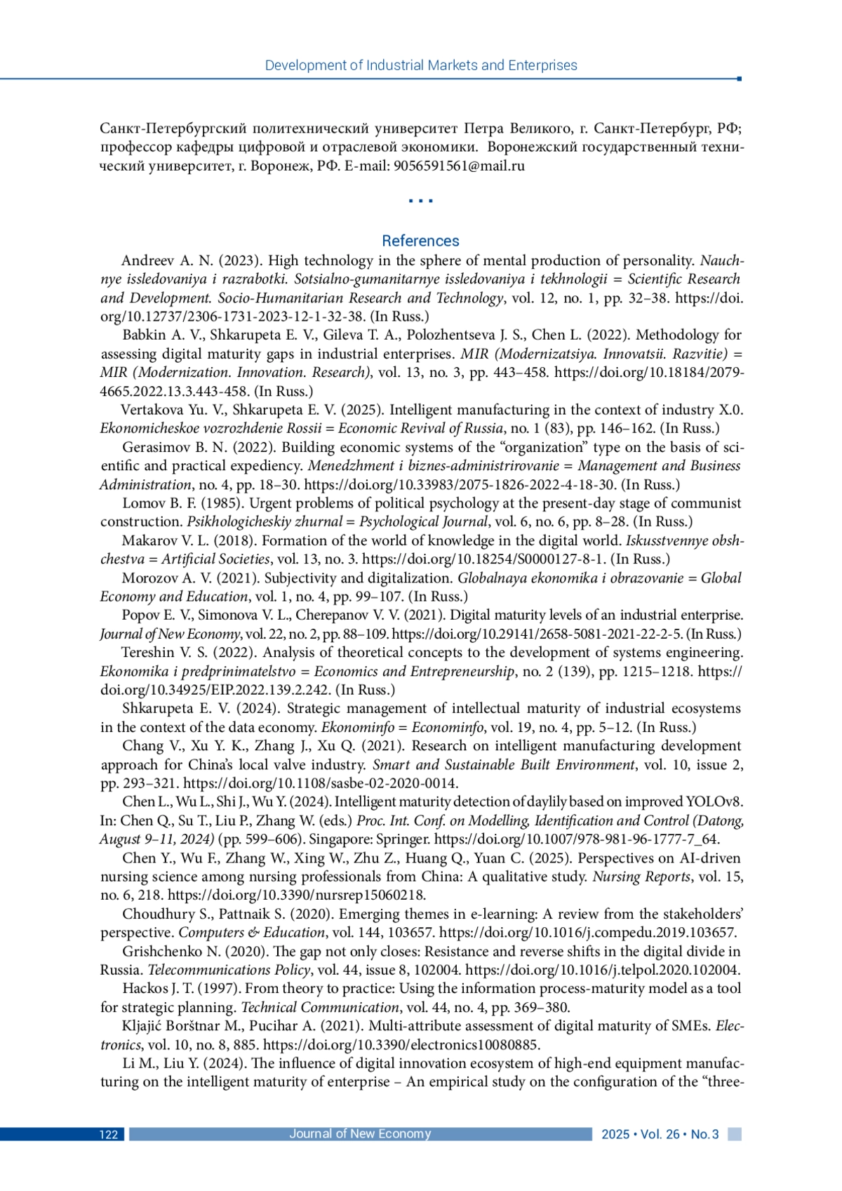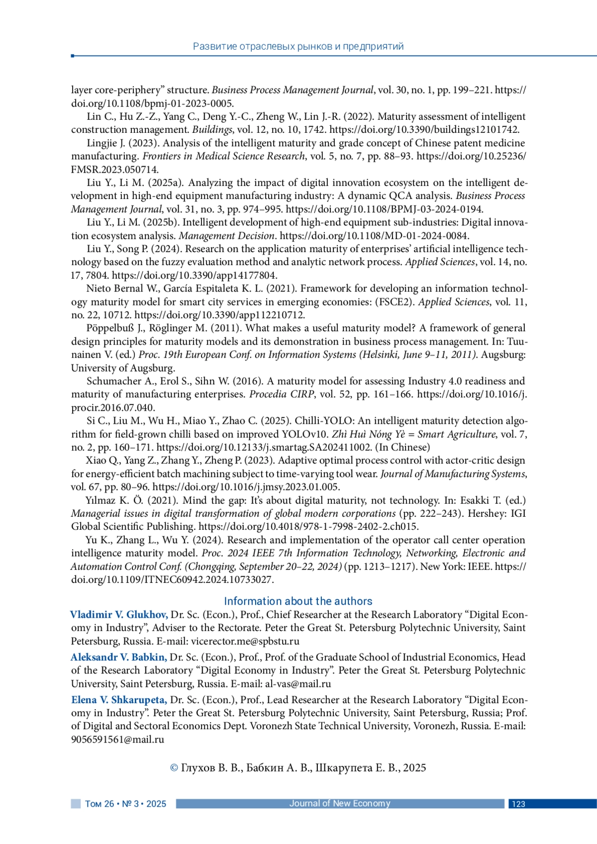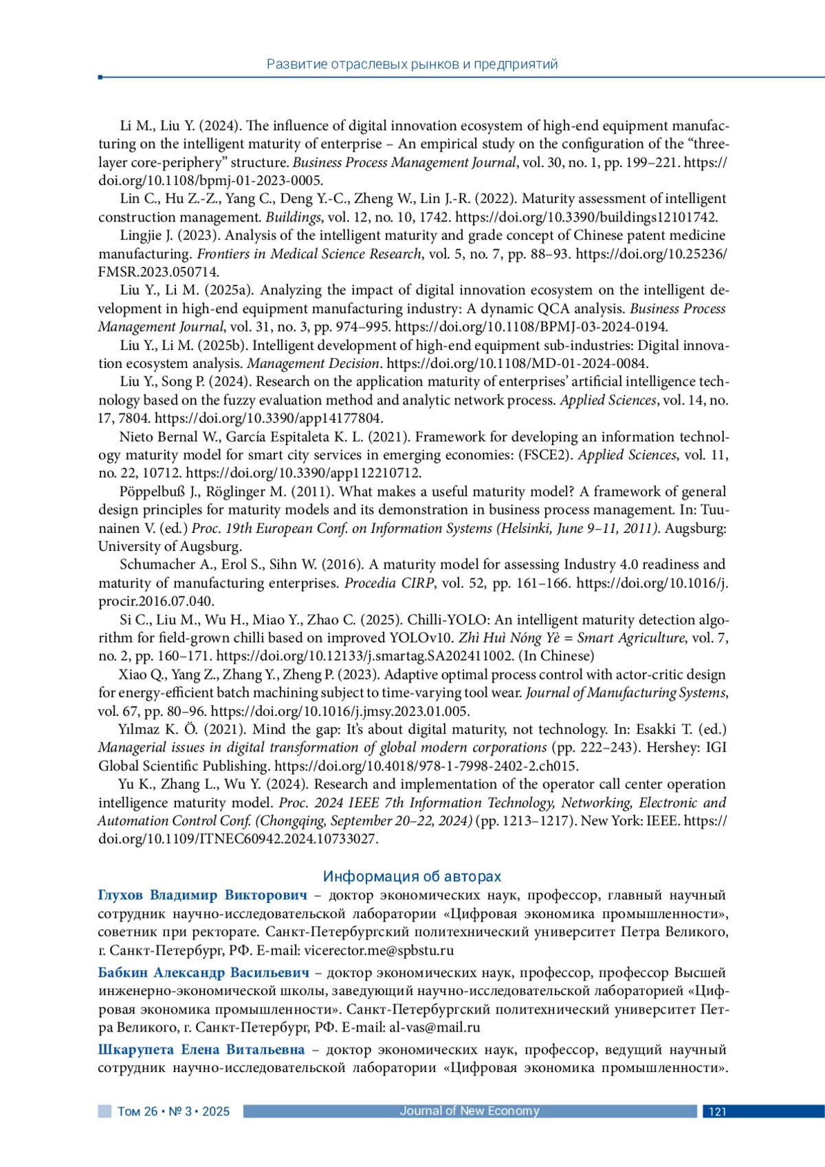 ГЛУХОВ В. В., БАБКИН А. В., ШКАРУПЕТА Е. В. КОНЦЕПТУАЛЬНЫЙ ФРЕЙМВОРК ДЛЯ ОЦЕНКИ И УПРАВЛЕНИЯ ИНТЕЛЛЕКТУАЛЬНОЙ ЗРЕЛОСТЬЮ ПРОМЫШЛЕННЫХ ЭКОСИСТЕМ // JOURNAL OF NEW ECONOMY. 2025. Т. 26 № 3