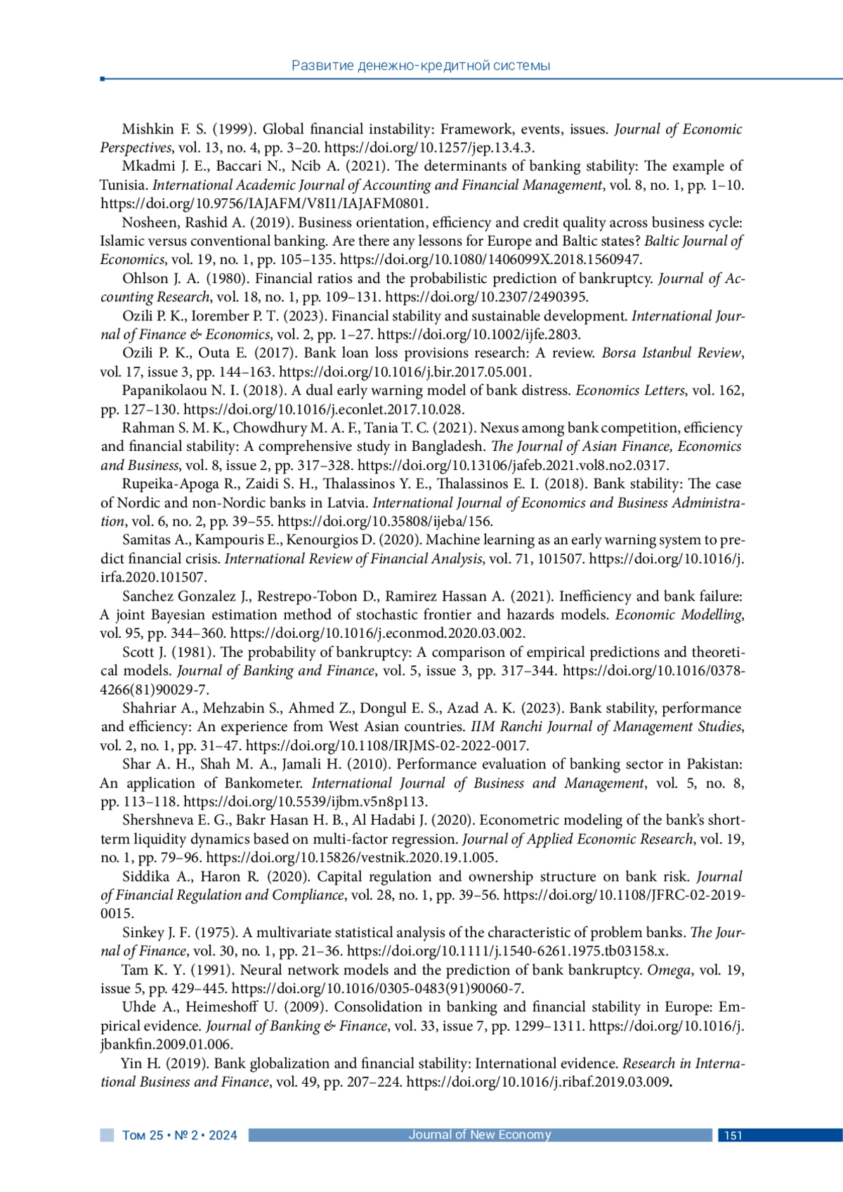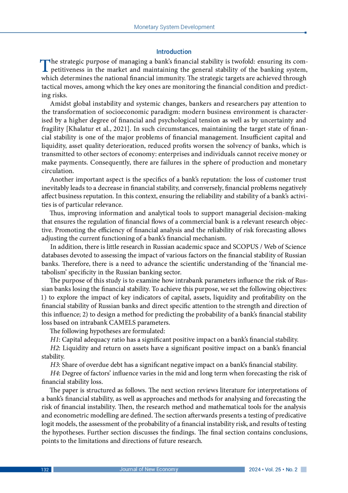 ШЕРШНЕВА Е. Г. CAMELS PARAMETERS' IMPACT ON THE RISK OF LOSING FINANCIAL STABILITY: THE CASE OF RUSSIAN BANKS // JOURNAL OF NEW ECONOMY. 2024. Т. 25 № 2