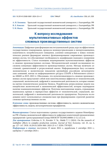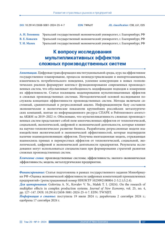 Цифровая трансформация институциональной среды, курс на эффективное государственное планирование, процессы неоиндустриализации и импортозамещения, изменчивость потребительского поведения, усиление конкуренции в новых геополитических реалиях формируют контекст функционирования современных производственных систем, что обуславливает необходимость модификации подходов к измерению их эффективности. Статья посвящена моделированию мультипликативных эффектов в сложных производственных системах. Методологической основой исследования послужила концепция эффективности производственных систем. Методы включали системный, сравнительный и регрессионный анализ. Информационную базу составили экономические и экологические показатели крупнейших российских металлургических компаний, взятые из информационного ресурса СПАРК и Рейтингового агентства AK&M за 2019–2022 гг. Обосновано, что мультипликативность сложных производственных систем представляет собой поле многочисленных эффектов от технологической, социальной, экологической, цифровой и экономической деятельности, которые влияют на научно-технологическое развитие бизнеса. Разработаны регрессионные модели взаимодействия экологической и экономической эффективностей, которые подтвердили наличие взаимодополняющих эффектов. Получена имитационная модель, отражающая взаимосвязь прямых и перекрестных эффектов от технологической, социальной, экологической, цифровой и экономической деятельности предприятия. Результаты исследования могут использоваться специалистами при формировании стратегий развития сложных производственных систем