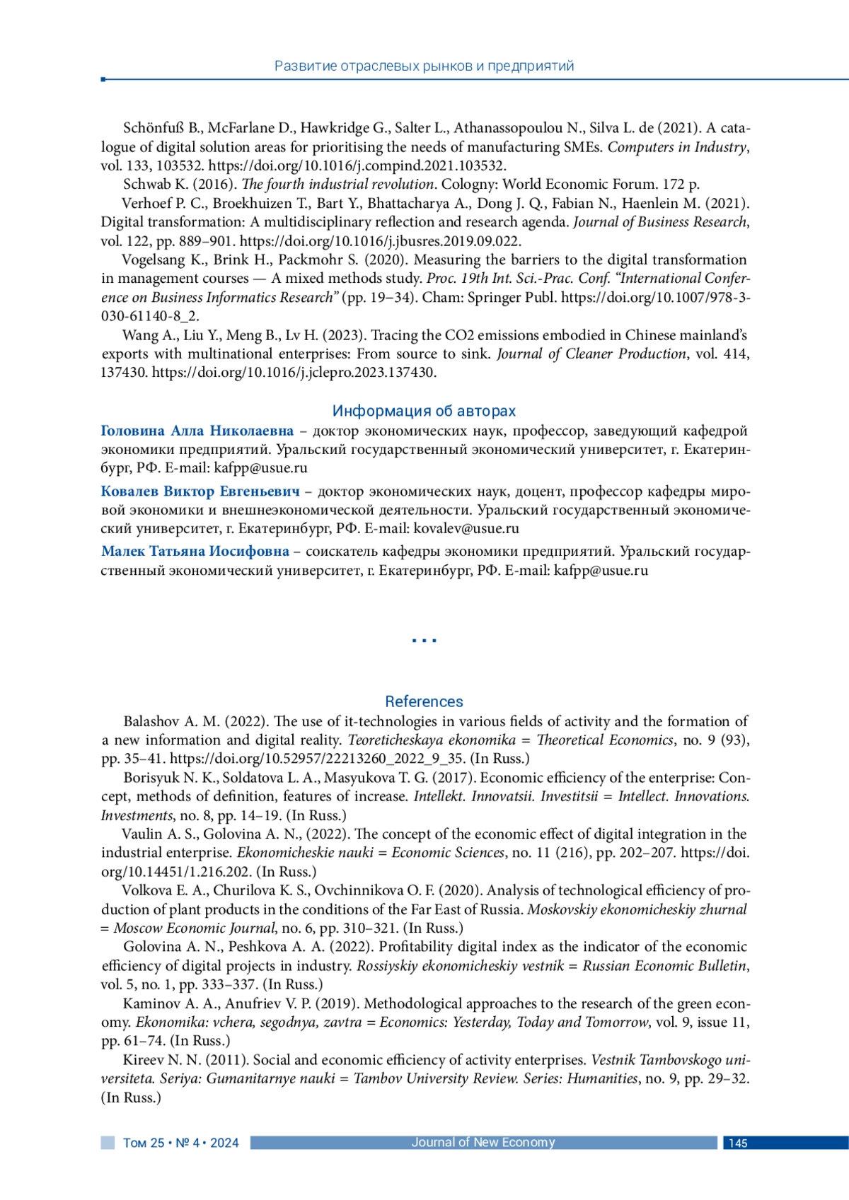 3. Ваулин А. С., Головина А. Н., (2022). Сущность экономического эффекта цифровой интеграции на промышленном предприятии // Экономические науки. № 11 (216). С. 202-207. DOI: 10.14451/1.216.202