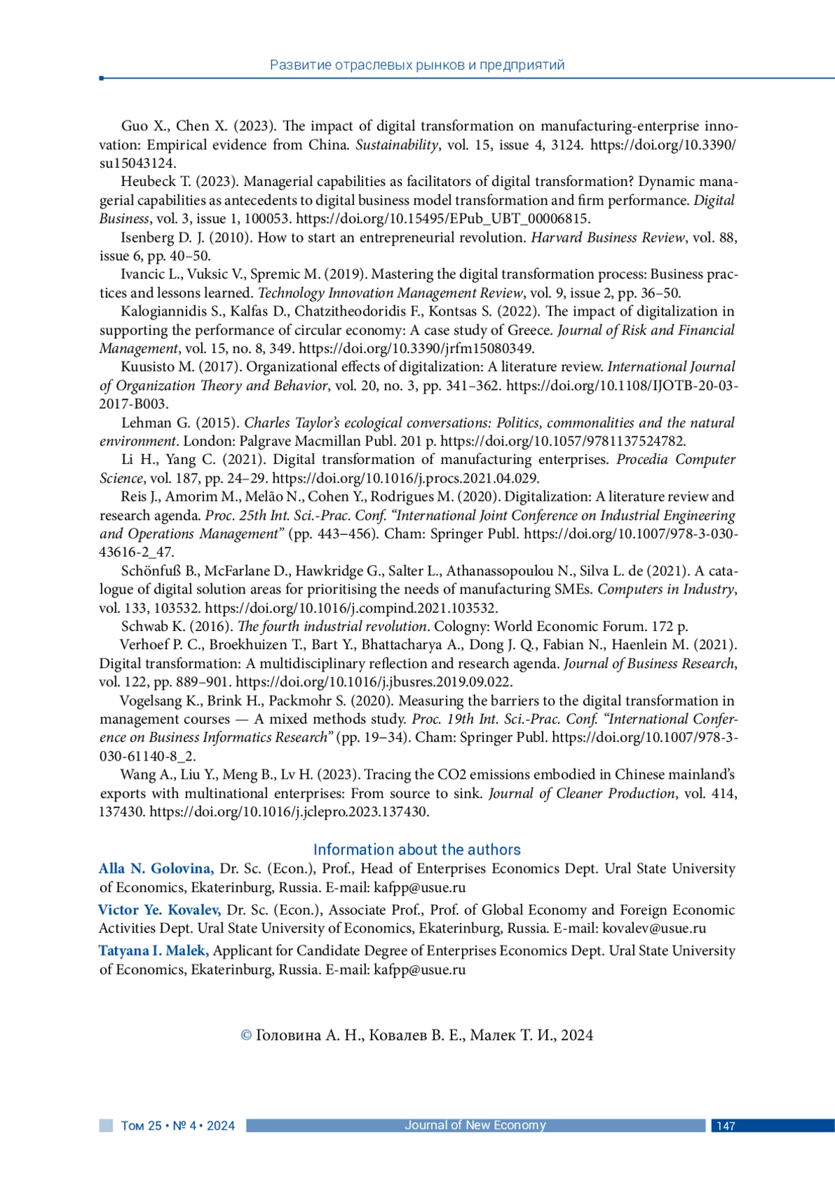 34. Li H., Yang C. (2021). Digital transformation of manufacturing enterprises. Procedia Computer Science, vol. 187, pp. 24-29. DOI: 10.1016/j.procs.2021.04.029 EDN: QPLXKY