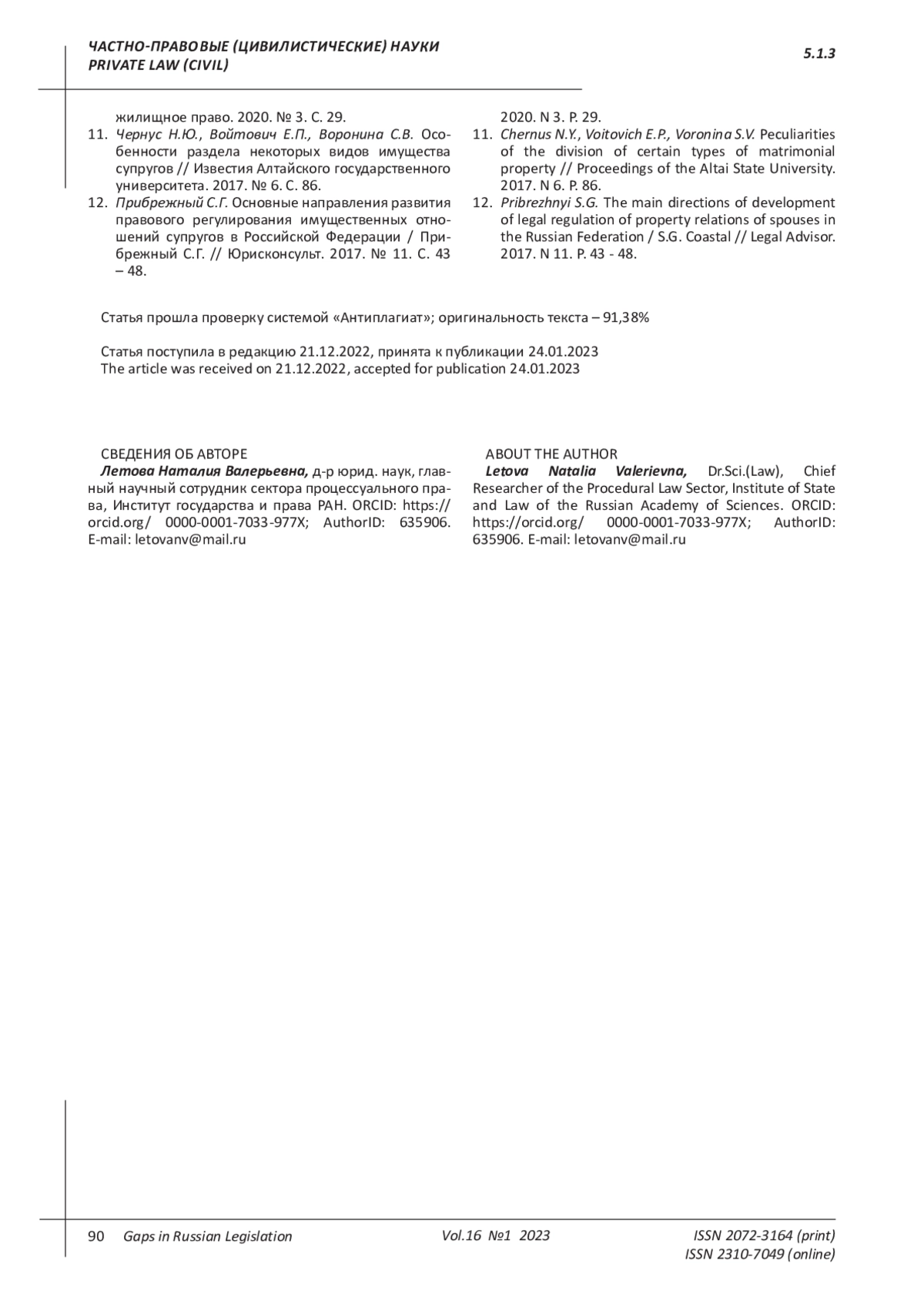 Letova N.V. Consequences of changing the marital status of spouses for business / Family business in the legal space of Russia: monograph / otv. ed. I.V. Ershova, A.N. Levushkin. Ch. 5, section 7. P. 519.
