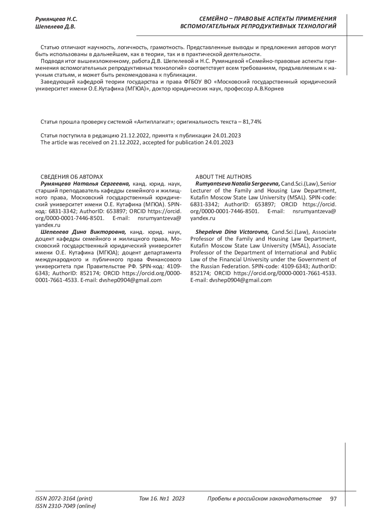 11. Попов В.П. “Правовые проблемы предупреждения фальсификации в сфере вспомогательных репродуктивных технологий” // Пробелы в российском законодательстве. - 2020. - № 5, Т. 13.- С. 288-292. EDN: VNKKXF