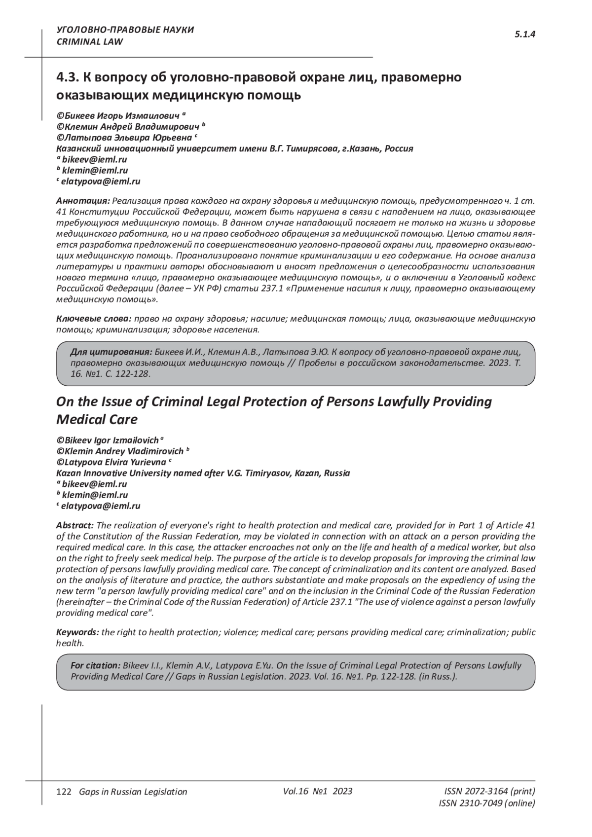 Bikeev I.I., Latypova E.Yu. On the need to criminalize violence against persons providing medical care // Materials of the XVII International Scientific and Practical Conference “Criminal Law: development strategy in the XXI century”. Moscow, 2020: Publishing House: RG-Press. pp. 183-186. EDN: IKSEIR