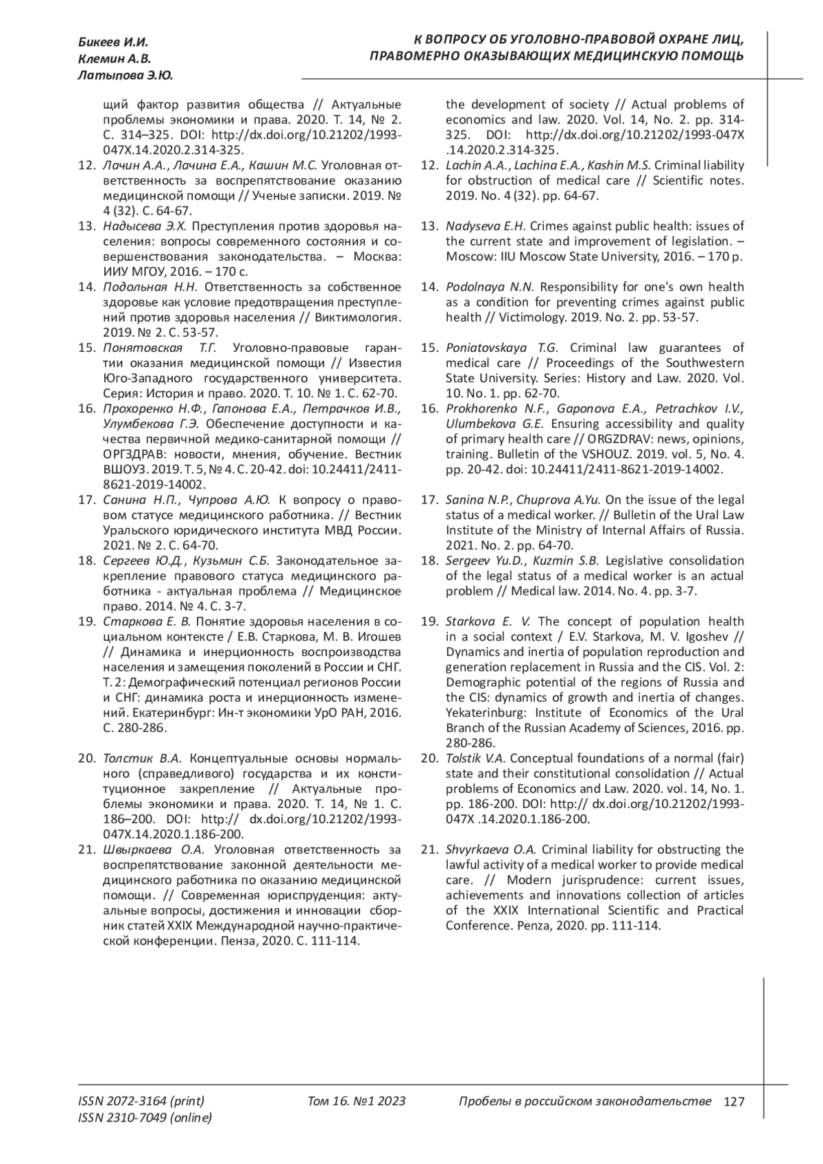 1. Бикеев И.И., Латыпова Э.Ю. О необходимости криминализации насилия в отношении лиц, осуществляющих медицинскую помощь // Материалы XVII Международной научно-практической конференции “Уголовное право: стратегия развития в XXI веке”. Москва, 2020: Издательство: РГ-Пресс. С. 183-186. EDN: IKSEIR