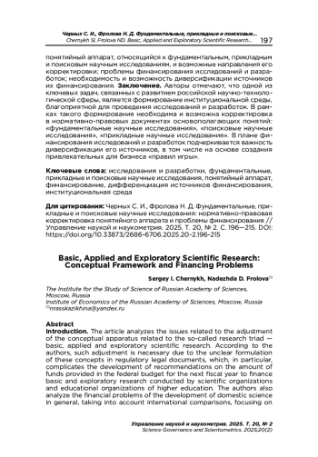 Результаты и дискуссия. Анализ и полемика в статье ведутся по следующим основным направлениям: понятийный аппарат, относящийся к фундаментальным, прикладным и поисковым научным исследованиям, и возможные направления его корректировки; проблемы финансирования исследований и разработок; необходимость и возможность диверсификации источников их финансирования.