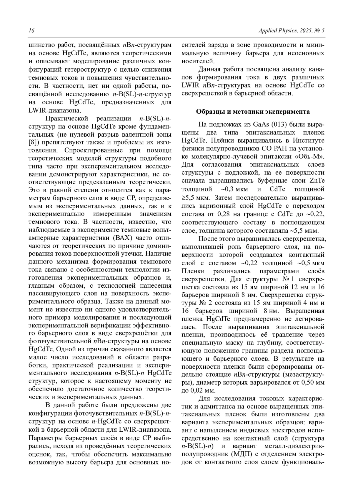 Для создания инфракрасных (ИК) фотоприёмных устройств для длинноволновой области инфракрасного (ИК) спектра (LWIR, 8–14 мкм), работающих при более высоких температурах охлаждения, чем классические фотодиоды на основе HgCdTe, перспективными являются униполярные барьерные nBn-структуры на основе HgCdTe [1].