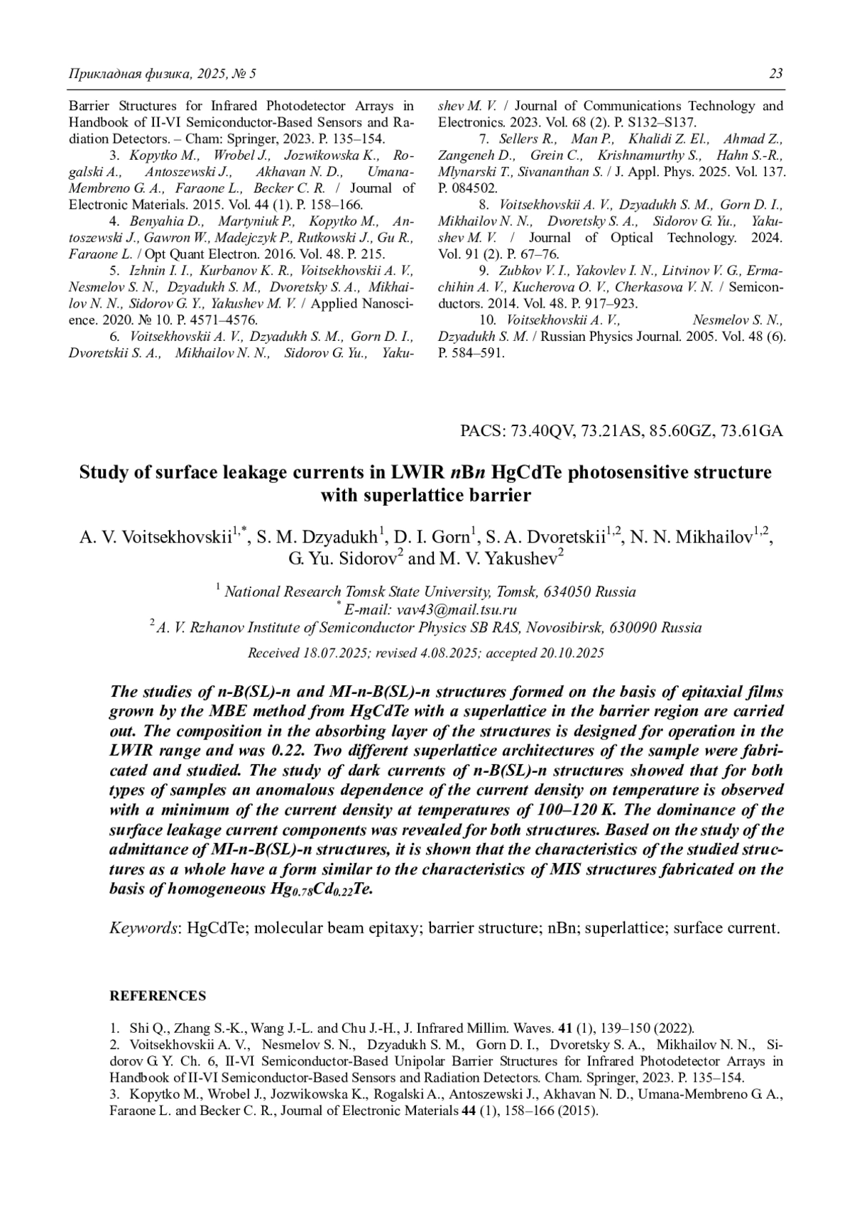 - Voitsekhovskii A. V., Nesmelov S. N., Dzyadukh S. M., Gorn D. I., Dvoretsky S. A., Mikhailov N. N., Sidorov G. Y. Ch. 6. II-VI Semiconductor-Based Unipolar Barrier Structures for Infrared Photodetector Arrays in Handbook of II-VI Semiconductor-Based Sensors and Radiation Detectors. – Cham: Springer, 2023. P. 135–154.