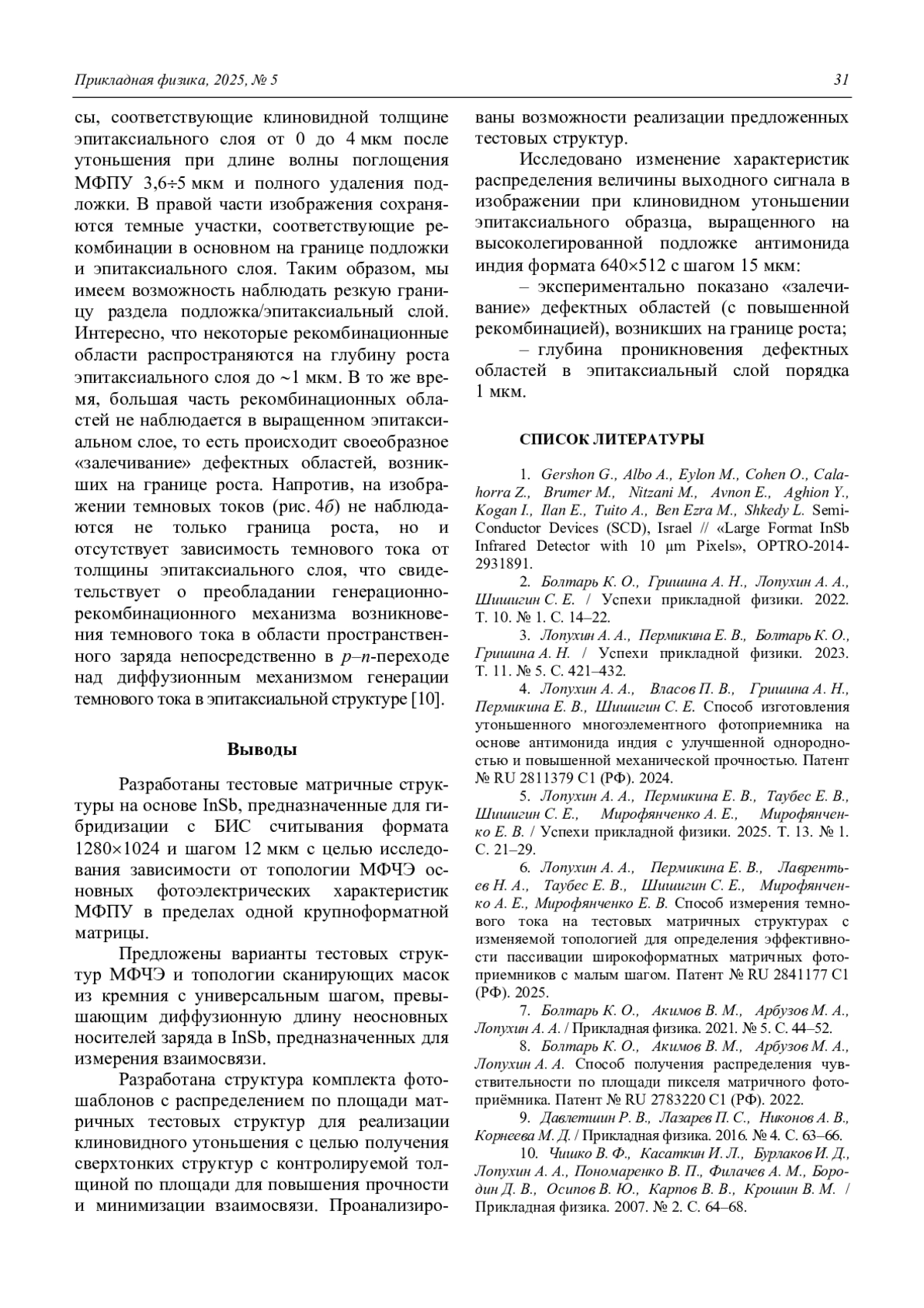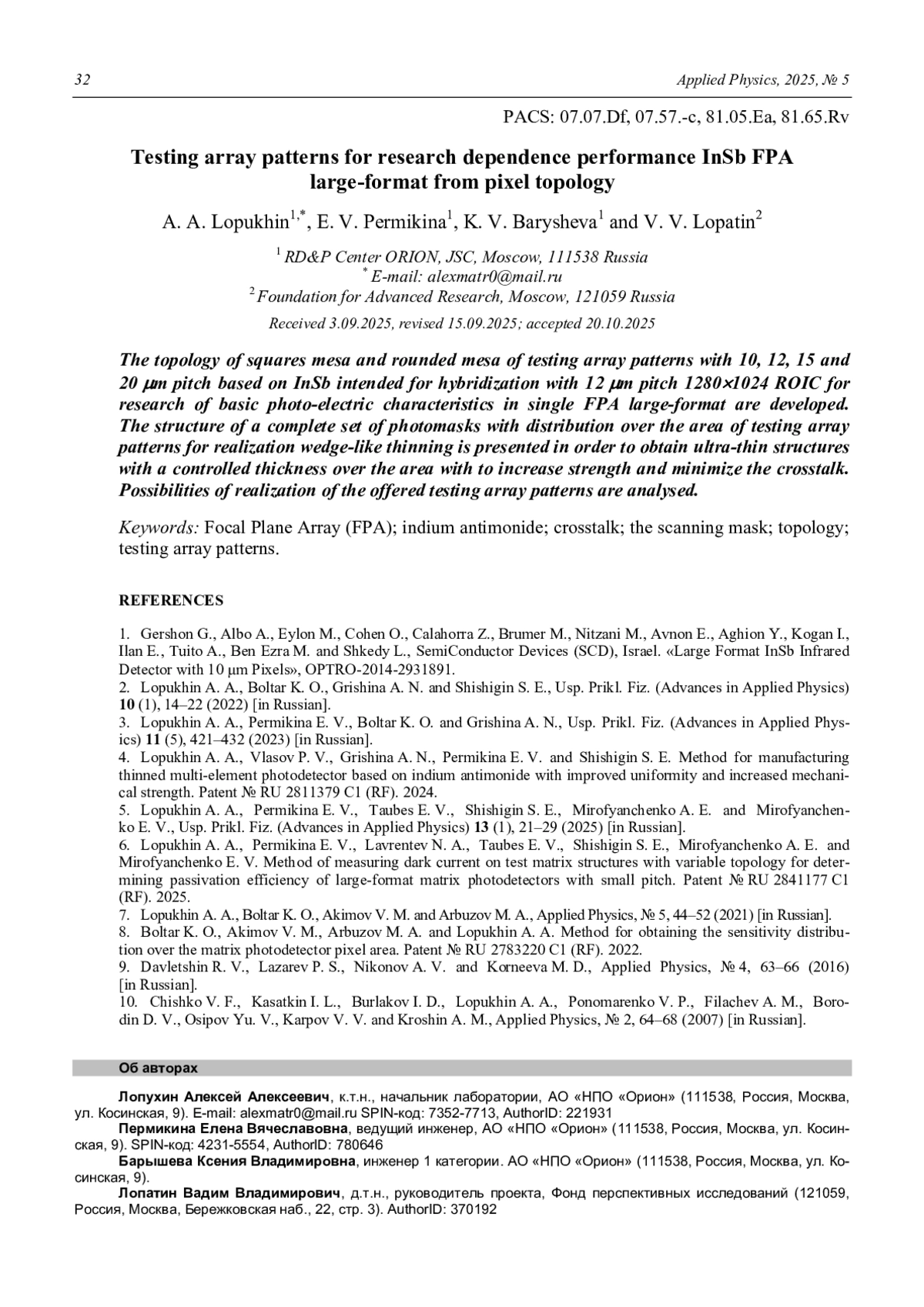 4. Лопухин А. А., Власов П. В., Гришина А. Н., Пермикина Е. В., Шишигин С. Е. Способ изготовления утоньшенного многоэлементного фотоприемника на основе антимонида индия с улучшенной однородностью и повышенной механической прочностью. Патент № RU 2811379 C1 (РФ). 2024.