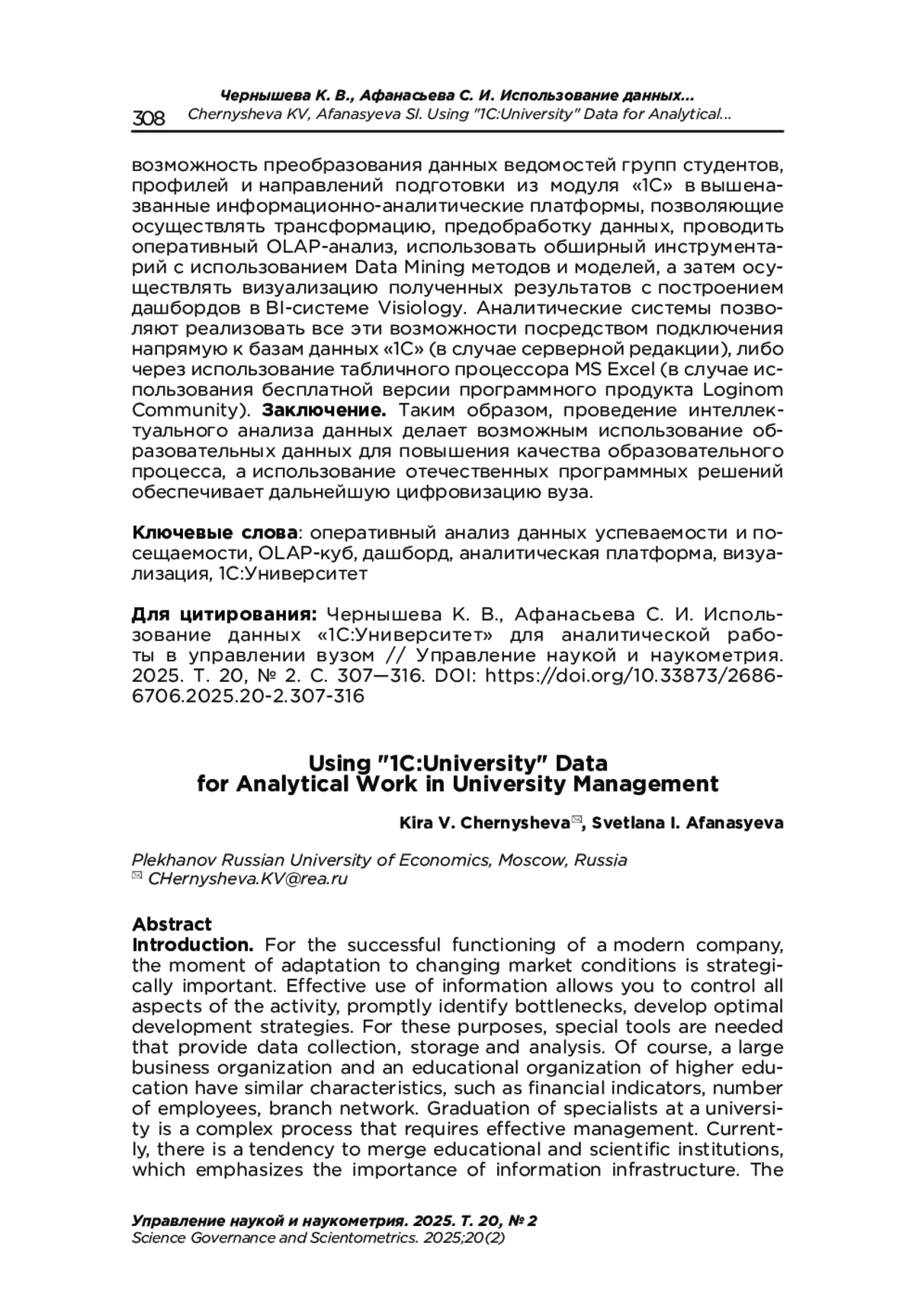 Результаты и дискуссия. Для совершенствования системы образовательного процесса в РЭУ имени Г. В. Плеханова авторами предлагаются системы аналитики данных Loginom и Visiology, позволяющие осуществлять оперативный анализ работы профессорско-преподавательского состава, студентов, их успеваемости и посещаемости, возможности проведения кластеризации студентов, прогнозирования успеваемости с использованием статистических методов (например, корреляционного, факторного анализа и др.), методов и моделей Data Mining на основе данных «1С: Университет». В частности, в выполненном исследовании наглядно демонстрируется возможность преобразования данных ведомостей групп студентов, профилей и направлений подготовки из модуля «1С» в вышеназванные информационно-аналитические платформы, позволяющие осуществлять трансформацию, предобработку данных, проводить оперативный OLAP-анализ, использовать обширный инструментарий c использованием Data Mining методов и моделей, а затем осуществлять визуализацию полученных результатов с построением дашбордов в BI-системе Visiology. Аналитические системы позволяют реализовать все эти возможности посредством подключения напрямую к базам данных «1С» (в случае серверной редакции), либо через использование табличного процессора MS Excel (в случае использования бесплатной версии программного продукта Loginom Community).