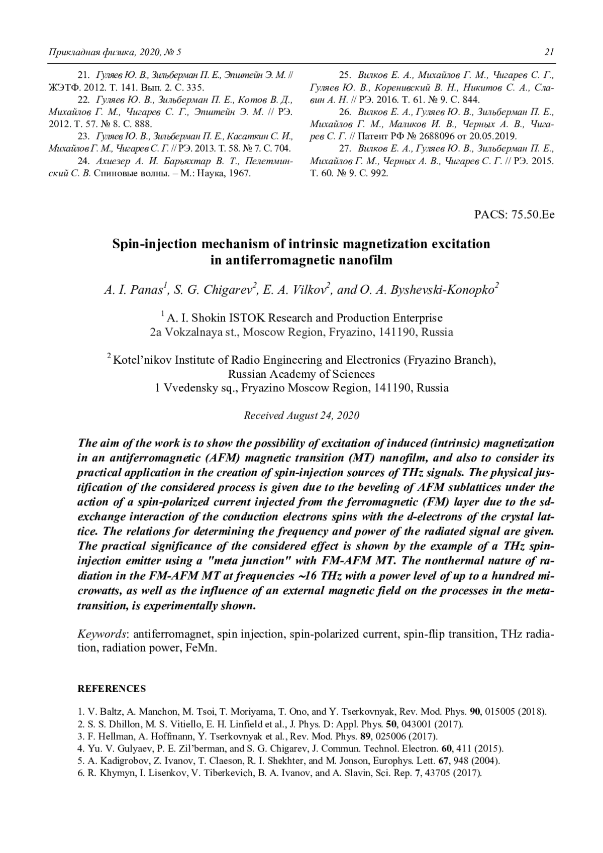 27. Вилков Е. А., Гуляев Ю. В., Зильберман П. Е., Михайлов Г. М., Черных А. В., Чигарев С. Г. // РЭ. 2015. Т. 60. № 9. С. 992.