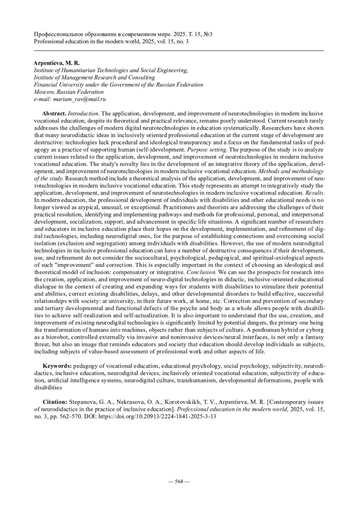 Введение. Проблематика применения, разработки и совершенствования нейротехнологий в современном инклюзивно ориентированном профессиональном образовании, несмотря на свою теоретическую и практическую актуальность, остается малоизученной. Современные исследования практически не рассматривают проблематику современных проблемы нейроцифровых технологий в образовании системно. Исследователями показано, что многие идеи нейродидактики в инклюзивно ориентированном профессиональном образовании на сегодняшнем этапе развития деструктивны: технологиям не хватает процессуальной и идеологической прозрачности и ориентации на основные задачи педагогики как практики поддержки (само) развития человека.