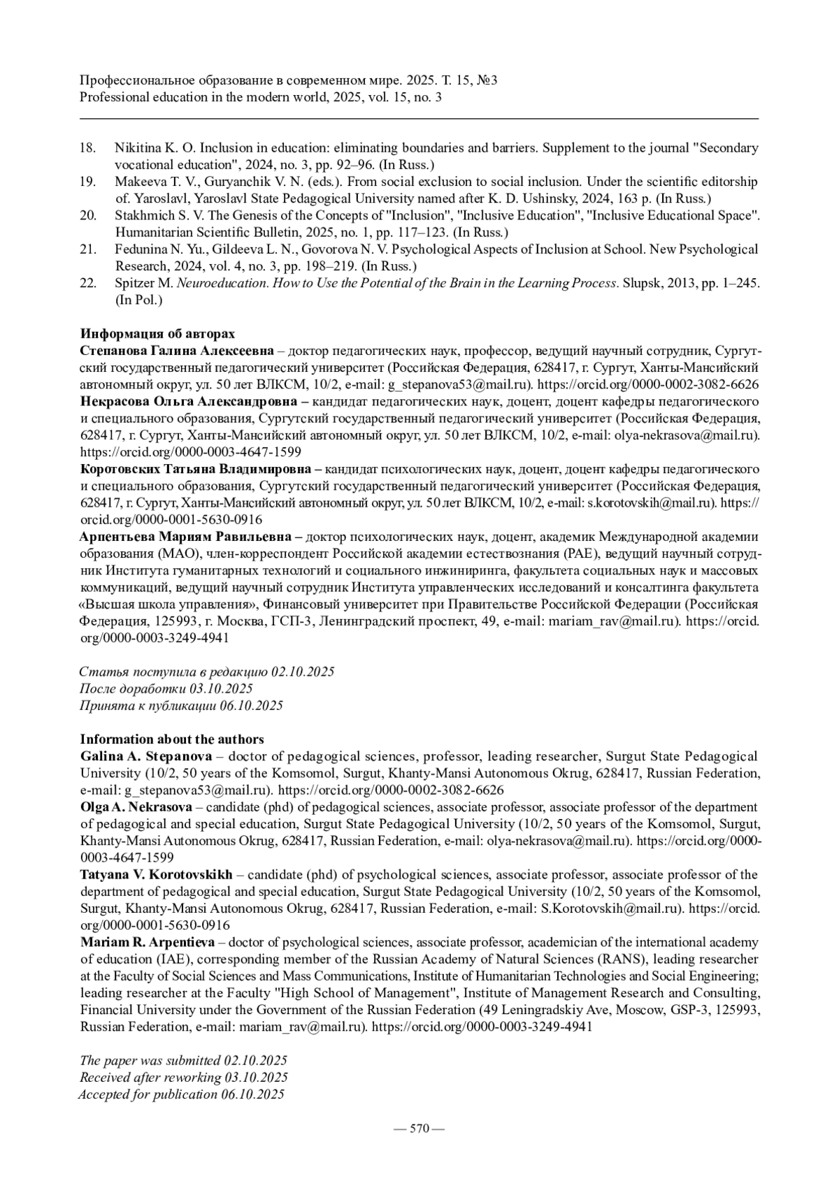 3. Stepanova G., Demchuk A., Tashcheva A., Gridneva S., Yakovleva J., Zaichikov Ya., Arpentieva M. Inclusion as an environmental imperative of educational activity in university, secondary and preschool education // E3SWeb of Conferences. 2021. Vol. 138. P. 1-9.