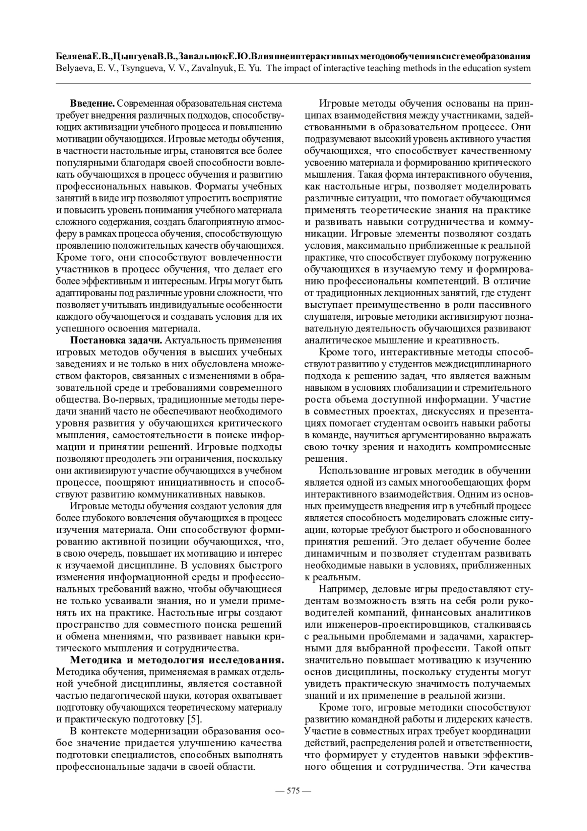 Введение. Статья посвящена интерактивным методам обучения, применяемым в преподавании экономических дисциплин в учреждениях высшего и среднего профессионального образования. В ней рассматриваются, описываются и анализируются возможности использования игровых технологий для повышения интерактивности процесса обучения и мотивации обучающихся независимо от уровня получаемого образования.