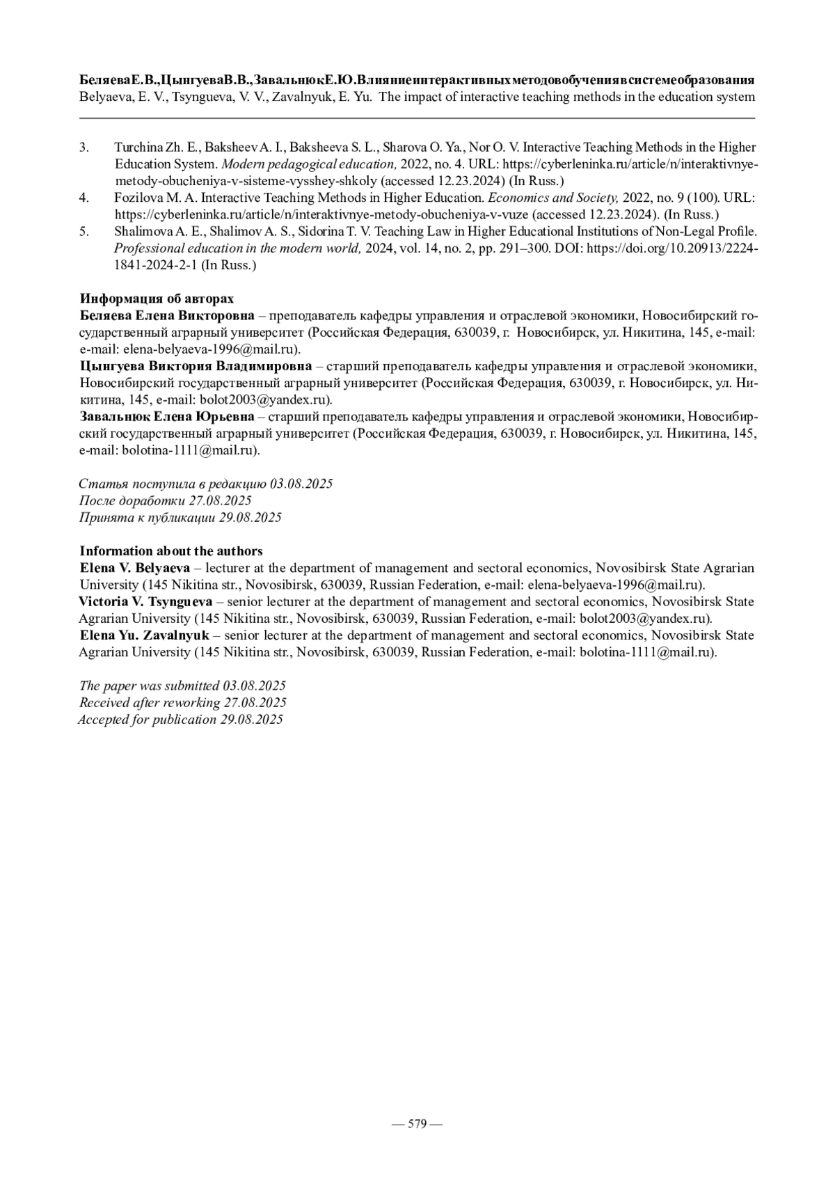3. Турчина Ж. Е., Бакшеев А. И., Бакшеева С. Л., Шарова О. Я., Нор О. В. Интерактивные методы обучения в системе высшей школы // Современное педагогическое образование. 2022. № 4. URL: https://cyberleninka.ru/article/n/interaktivnye-metody-obucheniya-v-sisteme-vysshey-shkoly (дата обращения: 23.12.2024).