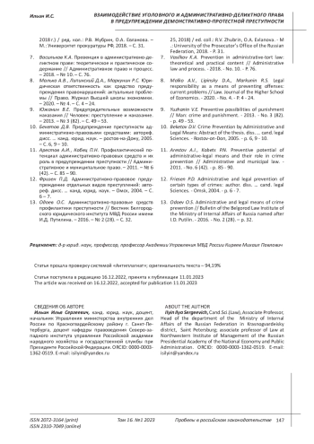 11. Арестов А.И., Кобец П.Н. Профилактический потенциал административно-правовых средств и их роль в предупреждении преступности // Административное и муниципальное право. - 2011. - № 6 (42). - С. 85 - 90. EDN: QAAGON