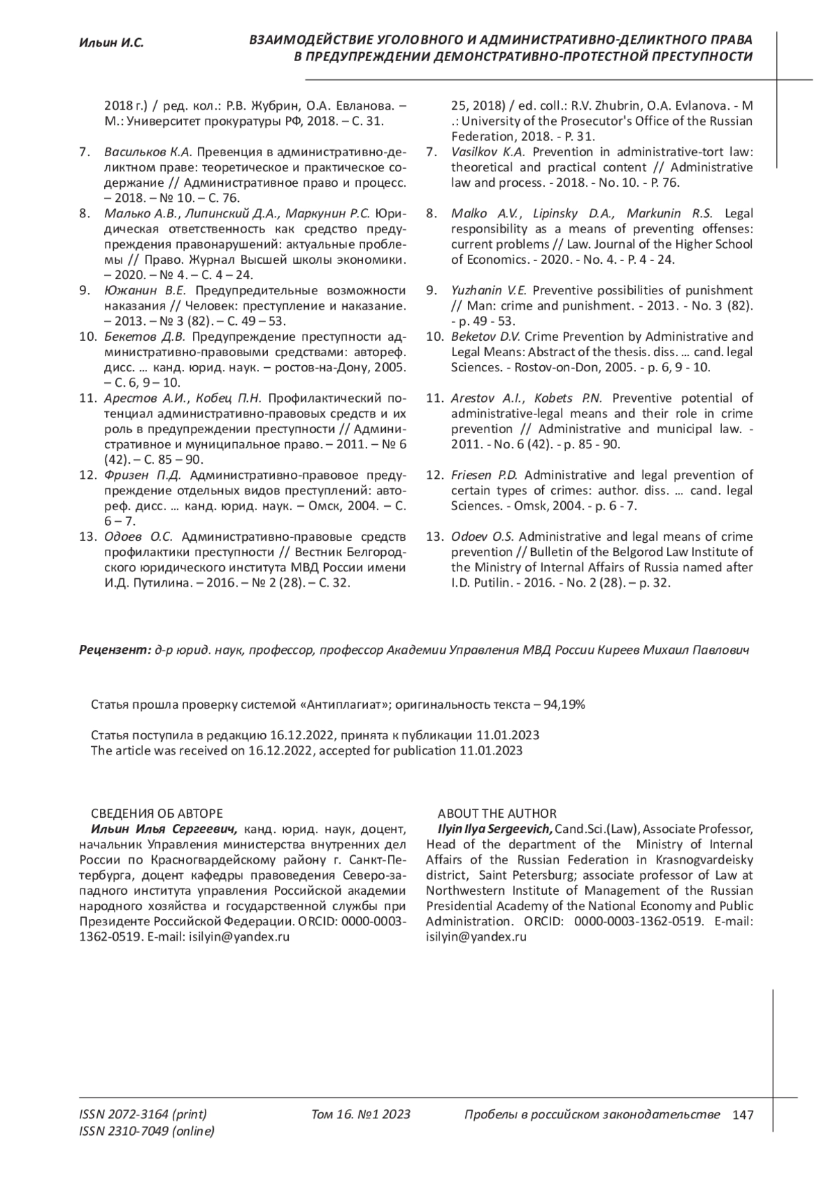 7. Васильков К.А. Превенция в административно-деликтном праве: теоретическое и практическое содержание // Административное право и процесс. - 2018. - № 10. - С. 76. EDN: VCCHMA