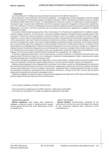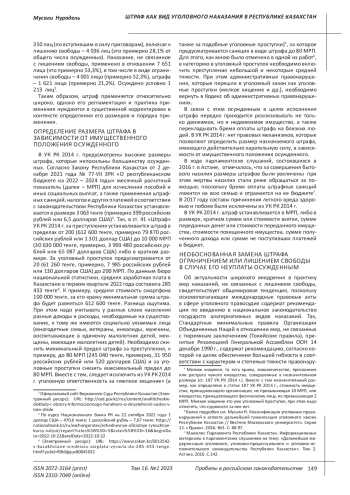 В УК РК 2014 г. предусмотрены высокие размеры штрафа, которые непосильны большинству осужденных. Согласно Закону Республики Казахстан от 2 декабря 2021 года № 77-VII ЗРК «О республиканском бюджете на 2022 – 2024 годы» месячный расчетный показатель (далее – МРП) для исчисления пособий и иных социальных выплат, а также применения штрафных санкций, налогов и других платежей в соответствии с законодательством Республики Казахстан устанавливается в размере 3 063 тенге (примерно 399 российских рублей или 6,5 долларов США)3. Так, в ст. 41 «Штраф» УК РК 2014 г. за преступления устанавливается штраф в пределах от 200 (612 600 тенге, примерно 79 870 российских рублей или 1 301 доллар США) до 10 000 МРП (30 630 000 тенге, примерно, 3 993 480 российских рублей или 65 087 долларов США) либо в кратном размере.