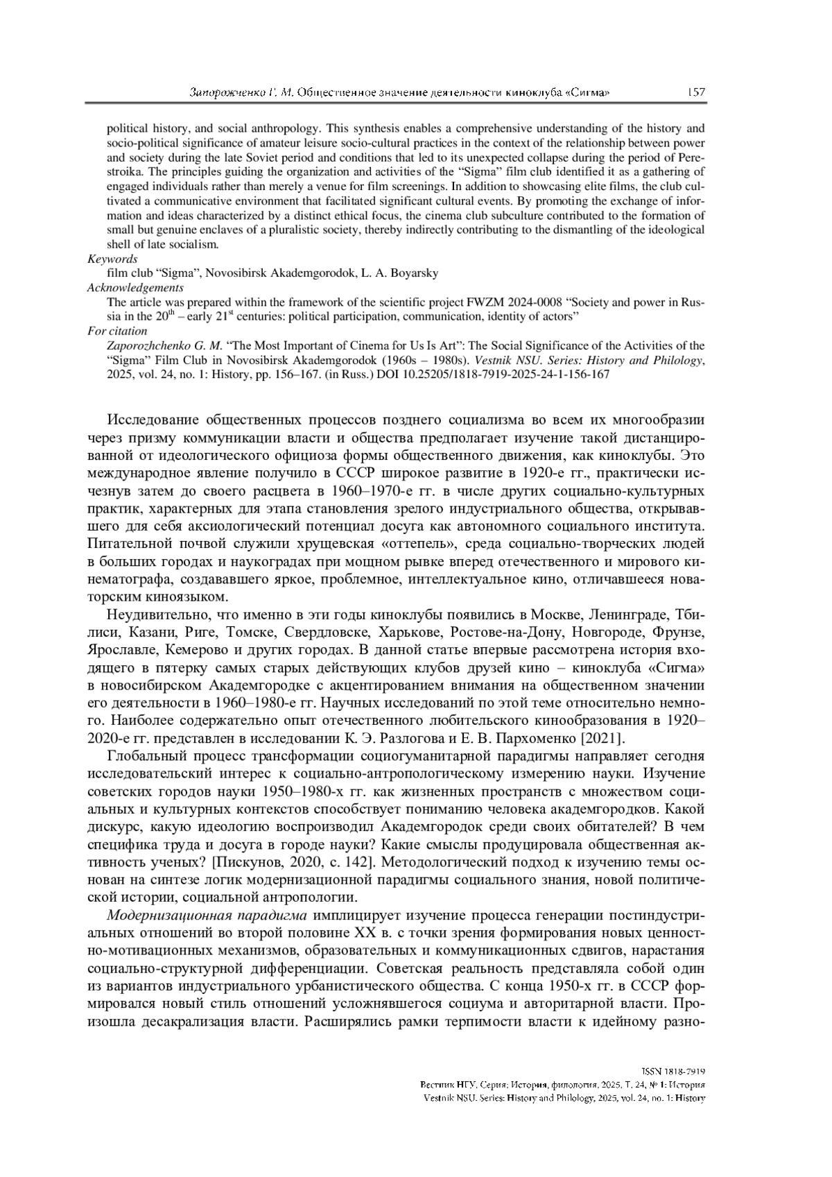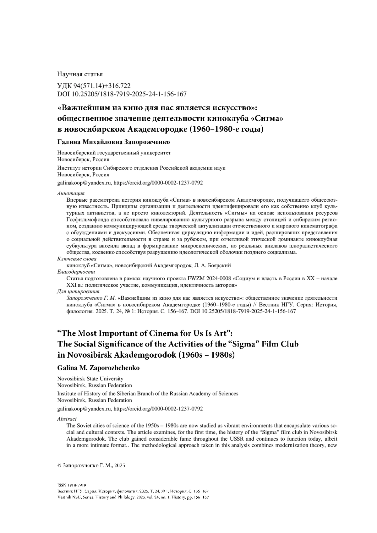 Впервые рассмотрена история киноклуба «Сигма» в новосибирском Академгородке, получившего общесоюзную известность. Принципы организации и деятельности идентифицировали его как собственно клуб культурных активистов, а не просто кинолекторий. Деятельность «Сигмы» на основе использования ресурсов Госфильмофонда способствовала нивелированию культурного разрыва между столицей и сибирским регионом, созданию коммуницирующей среды творческой актуализации отечественного и мирового кинематографа с обсуждениями и дискуссиями. Обеспечивая циркуляцию информации и идей, расширявших представления о социальной действительности в стране и за рубежом, при отчетливой этической доминанте киноклубная субкультура вносила вклад в формирование микроскопических, но реальных анклавов плюралистического общества, косвенно способствуя разрушению идеологической оболочки позднего социализма.