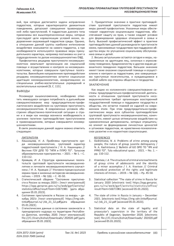 1. Кашинцева, Н. А. Проблемы преступности среди несовершеннолетних, групповой характер подростковой преступности / Н. А. Кашинцева // Вестник ГОУ ДПО ТО “ИПК и ППРО ТО”. Тульское образовательное пространство. - 2021. - № 1. - С. 110-112. EDN: MDLPRP