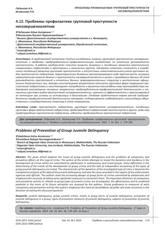 В предлагаемой читателю статье исследованы вопросы групповой преступности несовершеннолетних и проблемы предупредительно-профилактического воздействия на указанную разновидность преступности. В работе предпринята попытка вскрыть динамику и тенденции развития преступлений, совершаемых подростками в автономных и смешанных группах. Авторами отмечены сложности в определении тенденций развития групповой преступности и отсутствии самостоятельного учета групповых видов преступности подростков. Характеристика динамики рассматриваемого вида преступности основана сравнительном анализе данных о преступности несовершеннолетних в целом и приводимых данных об этой разновидности преступлений в отчетных данных правоохранительных структур и выступлениях официальных должностных лиц. Авторы констатируют возрастание опасности групповых форм совершения преступлений подростками и констатируют потребность в принятии масштабных мер противодействия им. Авторами рассмотрены основные направления предупредительно-профилактической деятельности в отношении групповых видов преступлений несовершеннолетних, оценена их эффективность и прогнозируемый ее потенциал при условии их активизации в дальнейшем. Отдавая предпочтение мерам ранней предупредительно-профилактической деятельности авторами, подчеркивается необходимость консолидации общественных и государственных структур в этом направлении.