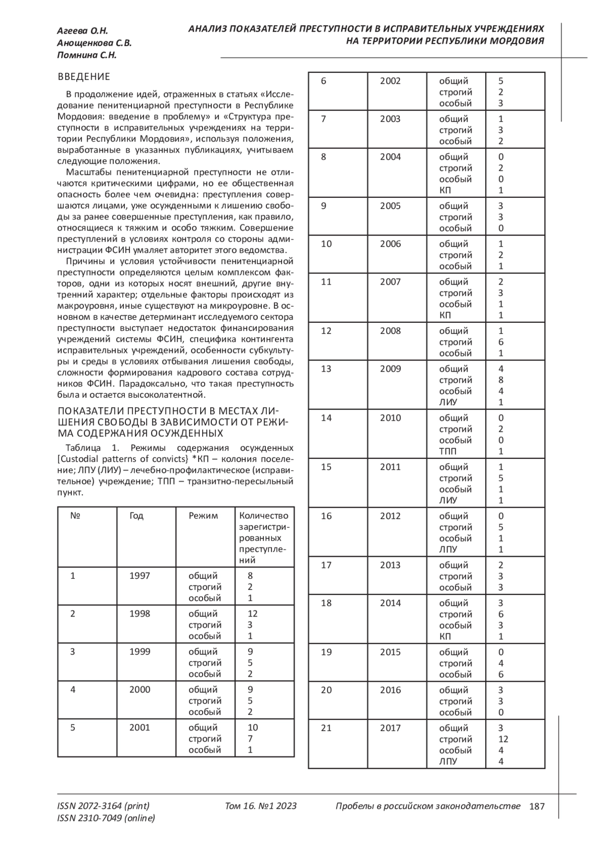 В продолжение идей, отраженных в статьях «Иссле - дование пенитенциарной преступности в Республике Мордовия: введение в проблему» и «Структура пре - ступности в исправительных учреждениях на терри - тории Республики Мордовия», используя положения, выработанные в указанных публикациях, учитываем следующие положения. Масштабы пенитенциарной преступности не отли - чаются критическими цифрами, но ее общественная опасность более чем очевидна: преступления совер - шаются лицами, уже осужденными к лишению свобо - ды за ранее совершенные преступления, как правило, относящиеся к тяжким и особо тяжким. Совершение преступлений в условиях контроля со стороны адми - нистрации ФСИН умаляет авторитет этого ведомства.