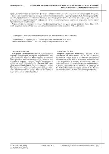 Цель и задачи написания статьи - исследование пробелов в международно-правовом регулировании групп отношений в сфере научно-технического прогресса в условиях социально-политической трансформации. Методологический подход. В работе используются общенаучные методы, в частности анализа и сравнения, а также методы юридического толкования. Результаты и выводы. В статье рассматривается актуальность и степень научной разработанности проблемы пробелов и их восполнения в международном праве в сфере научно-технического прогресса. Оригинальность и ценность работы заключается в определении природы пробела в международном праве в сфере научно-технического прогресса, выявлении возможностей его фиксации и способов восполнения в современном международном праве.