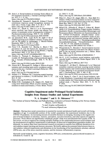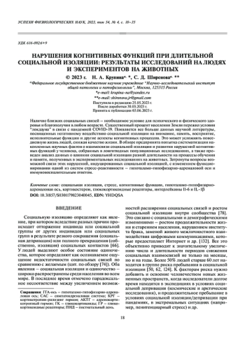 Статья: НАРУШЕНИЯ КОГНИТИВНЫХ ФУНКЦИЙ ПРИ ДЛИТЕЛЬНОЙ СОЦИАЛЬНОЙ ИЗОЛЯЦИИ: РЕЗУЛЬТАТЫ ИССЛЕДОВАНИЙ НА ЛЮДЯХ И ЭКСПЕРИМЕНТОВ НА ЖИВОТНЫХ (2023)