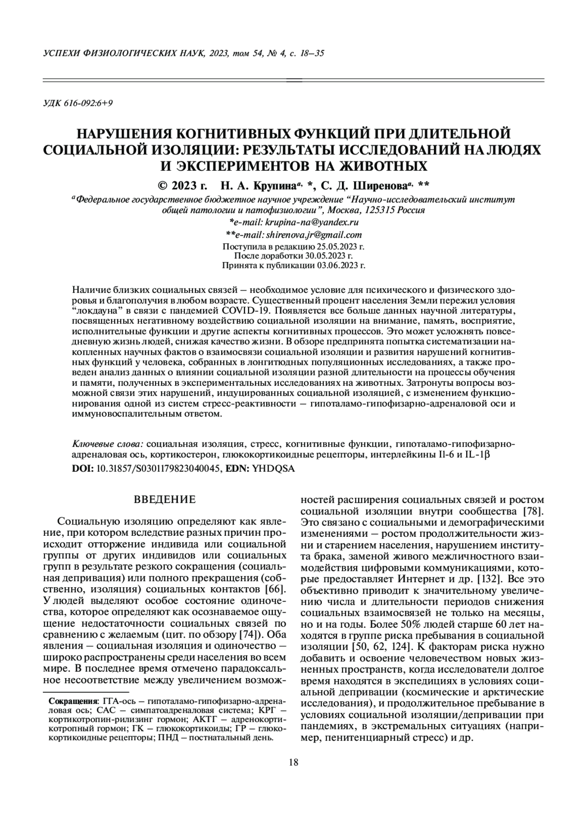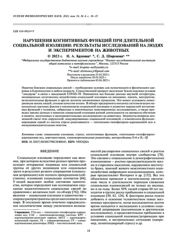 КРУПИНА Н. А., ШИРЕНОВА С. Д. НАРУШЕНИЯ КОГНИТИВНЫХ ФУНКЦИЙ ПРИ ДЛИТЕЛЬНОЙ СОЦИАЛЬНОЙ ИЗОЛЯЦИИ: РЕЗУЛЬТАТЫ ИССЛЕДОВАНИЙ НА ЛЮДЯХ И ЭКСПЕРИМЕНТОВ НА ЖИВОТНЫХ // УСПЕХИ ФИЗИОЛОГИЧЕСКИХ НАУК. 2023. Т. 54 № 4 (6 СТ.)
