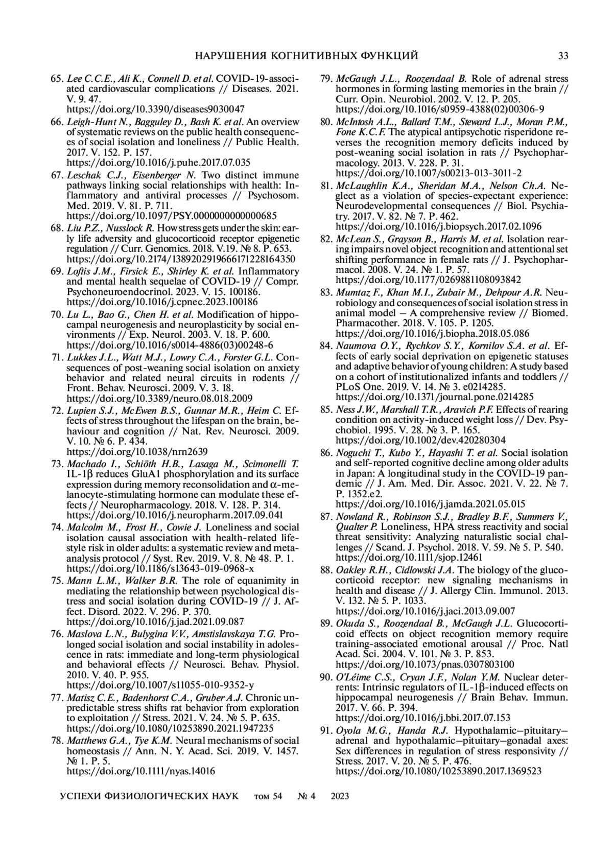 Наличие близких социальных связей – необходимое условие для психического и физического здоровья и благополучия в любом возрасте. Существенный процент населения Земли пережил условия “локдауна” в связи с пандемией COVID-19. Появляется все больше данных научной литературы, посвященных негативному воздействию социальной изоляции на внимание, память, восприятие, исполнительные функции и другие аспекты когнитивных процессов. Это может усложнять повседневную жизнь людей, снижая качество жизни. В обзоре предпринята попытка систематизации накопленных научных фактов о взаимосвязи социальной изоляции и развития нарушений когнитивных функций у человека, собранных в лонгитюдных популяционных исследованиях, а также проведен анализ данных о влиянии социальной изоляции разной длительности на процессы обучения и памяти, полученных в экспериментальных исследованиях на животных. Затронуты вопросы возможной связи этих нарушений, индуцированных социальной изоляцией, с изменением функционирования одной из систем стресс-реактивности – гипоталамо-гипофизарно-адреналовой оси и иммуновоспалительным ответом.