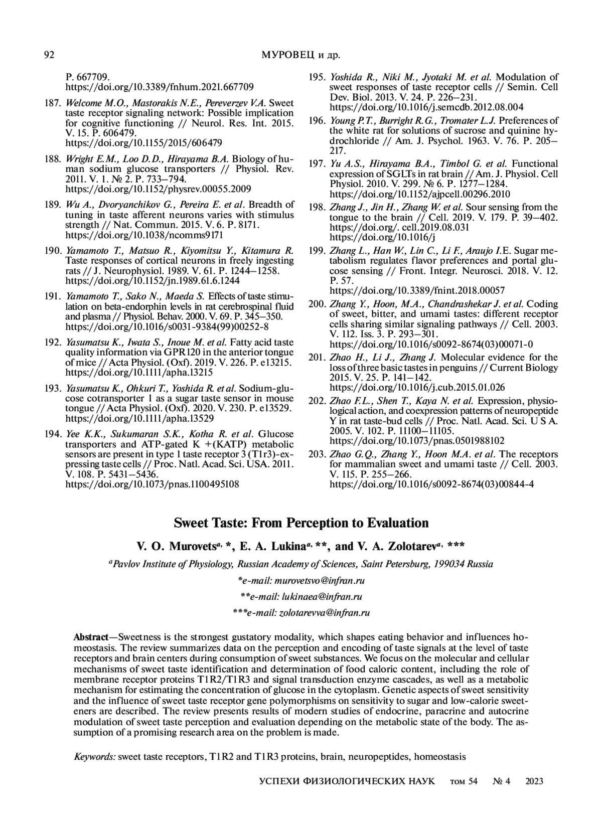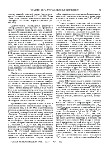 186. von Molitor E., Riedel K., Krohn M. et al. Sweet taste is complex: signaling cascades and circuits involved in sweet sensation // Front. Hum. Neurosci. 2021. V. 15. P. 667709. DOI: 10.3389/fnhum.2021.667709 EDN: QMXKCA